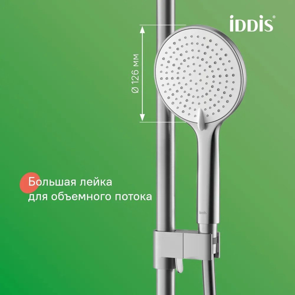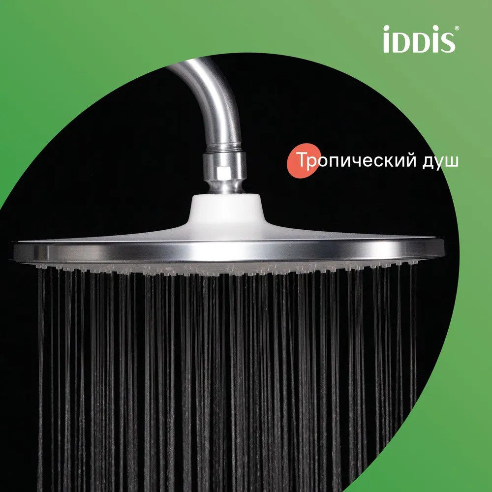 • в комплекте гибкий шланг из ПВХ 1,5 м, верхняя (d = 228 мм) и ручная (3 режима, d = 116 мм) лейки из коллекции Optima Home в тон;