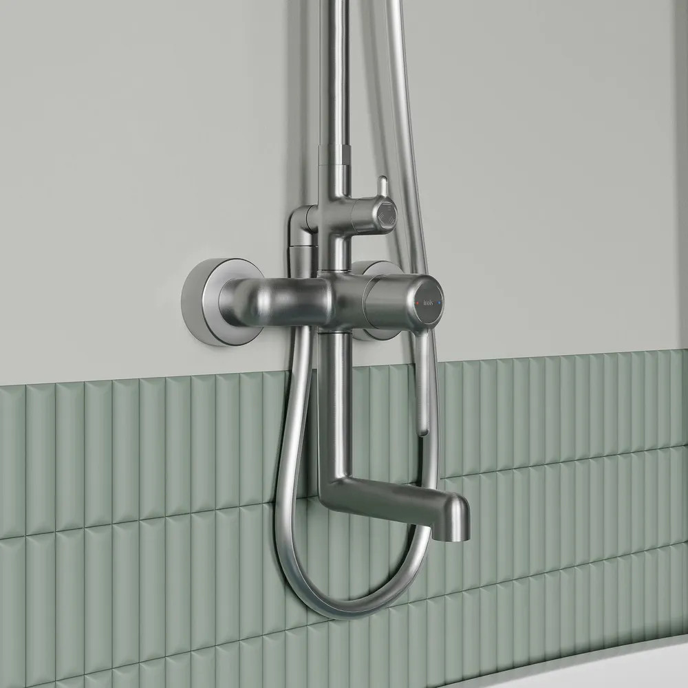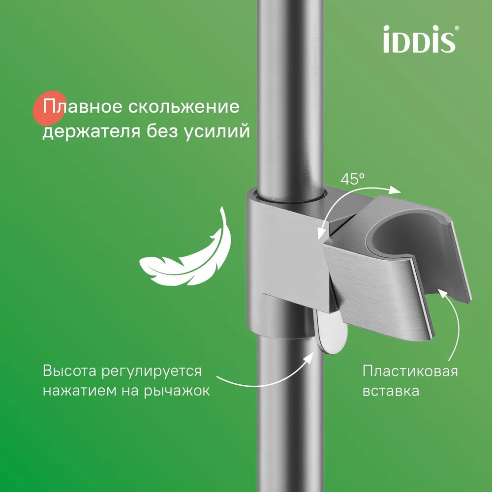 • поток воды переключается поворотным керамическим дивертором на стойке — он повторяет дизайн ручки, выглядит стильно и элегантно;