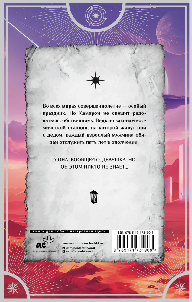 💳 Оплатить за товар можно при получении 🇰🇿 Есть бесплатная доставка по Казахстану от 1 дня 🎁 Копите бонусы с каждой покупки Серия: Любовь внеземная Во всех мирах совершеннолетие — особый праздник. Но Камерон не спешит радоваться собственному. Ведь по законам космической станции, на которой живут они с дедом, каждый взрослый мужчина обязан отслужить пять лет в ополчении. А она, вообще-то, девушка. Но об этом никто не знает. |