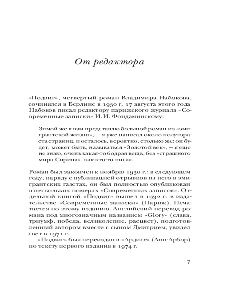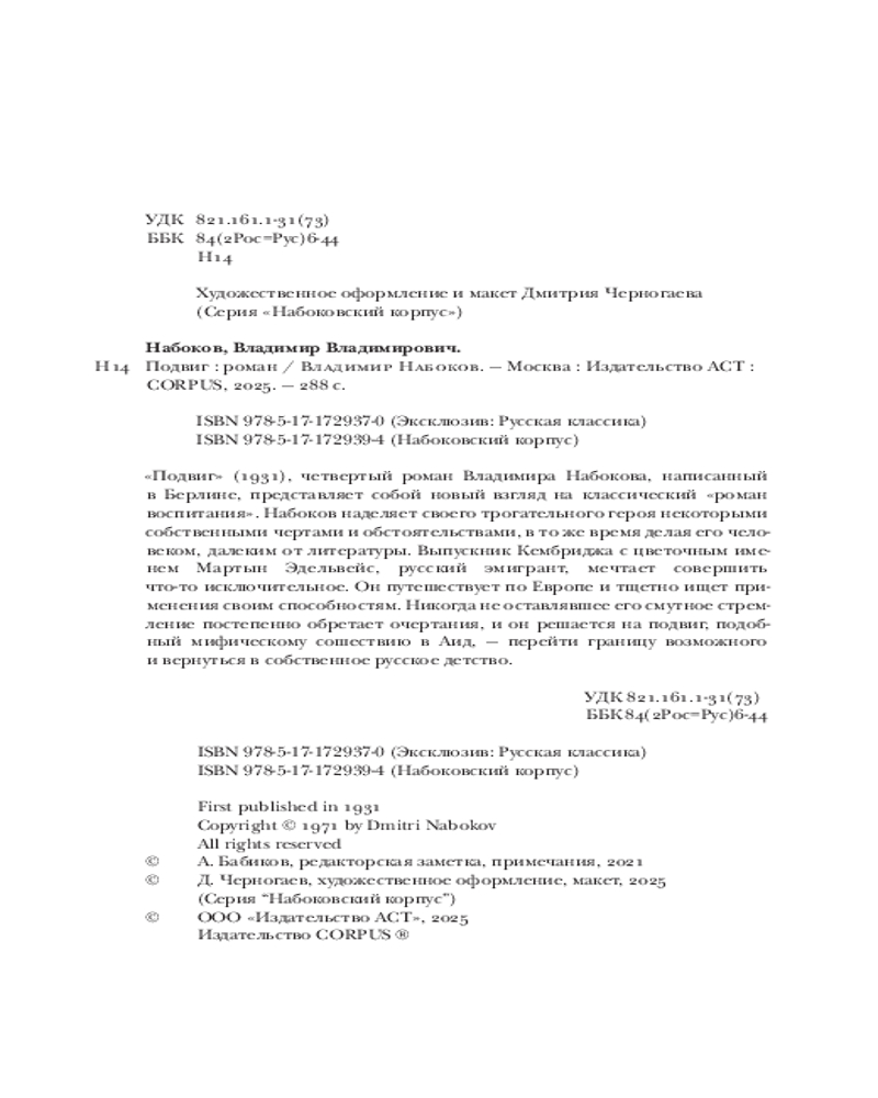 💳 Оплатить за товар можно при получении 🇰🇿 Есть бесплатная доставка по Казахстану от 1 дня 🎁 Копите бонусы с каждой покупки Серия: Набоковский корпус (мягкая обложка) «Подвиг» (1931), четвертый роман Владимира Набокова, написанный в Берлине, представляет собой новый взгляд на классический «роман воспитания». Набоков наделяет своего трогательного героя некоторыми собственными чертами и обстоятельствами, в то же время делая его человеком, далеким от литературы. Выпускник Кембриджа с цветочным именем Мартын Эдельвейс, русский эмигрант, мечтает совершить что‑то исключительное. Он путешествует по Европе и тщетно ищет применения своим способностям. Никогда не оставлявшее его смутное стремление постепенно обретает очертания, и он решается на подвиг, подобный мифическому сошествию в Аид, — перейти границу возможного и вернуться в собственное русское детство. |