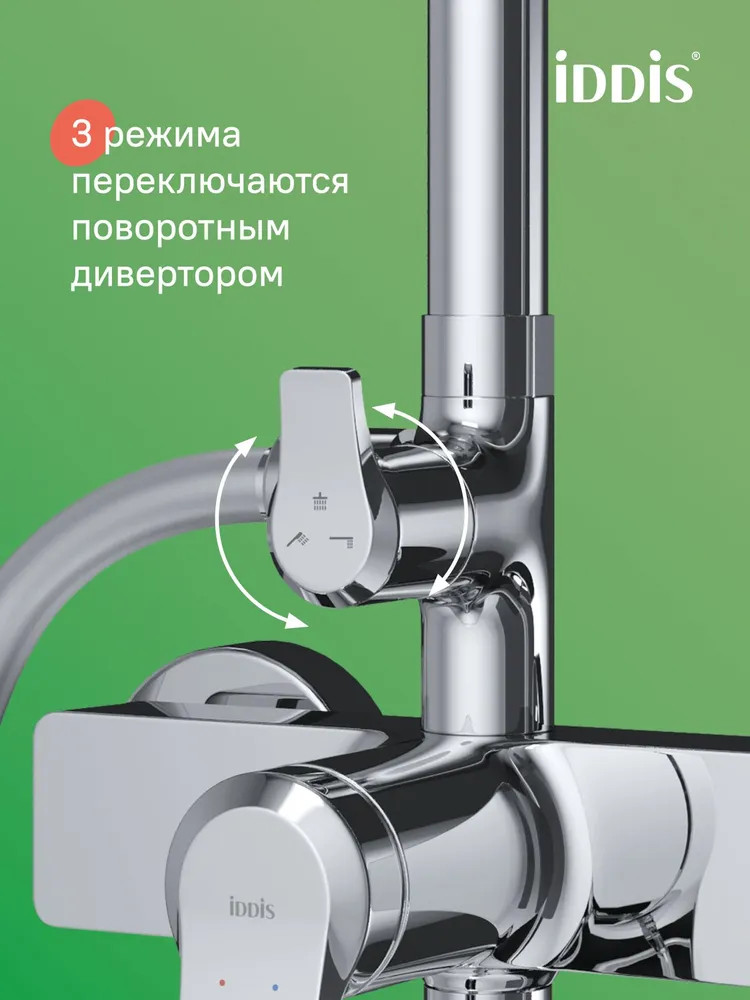 • поворотный дивертор надежно переключает поток воды даже при минимальном давлении воды;