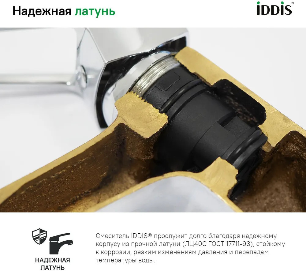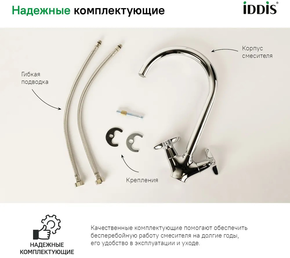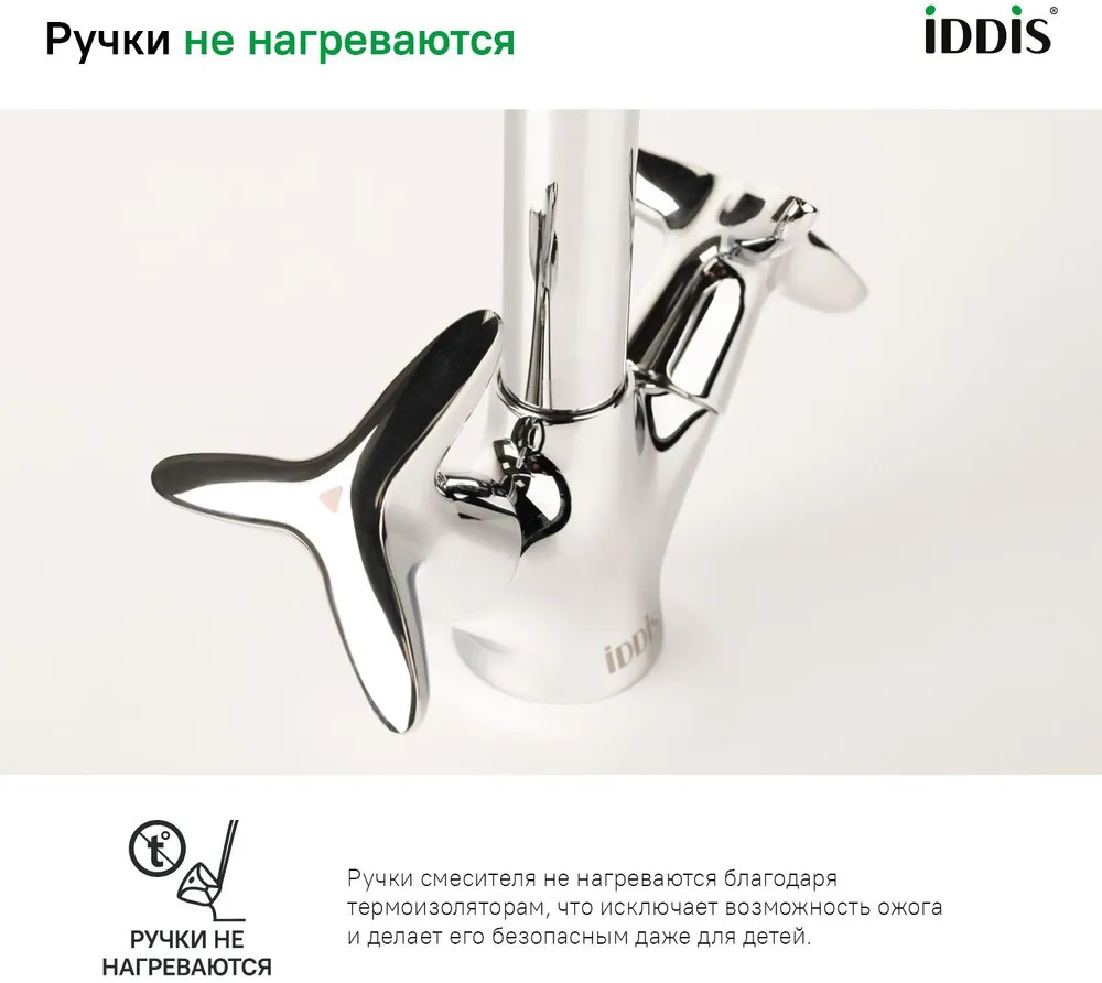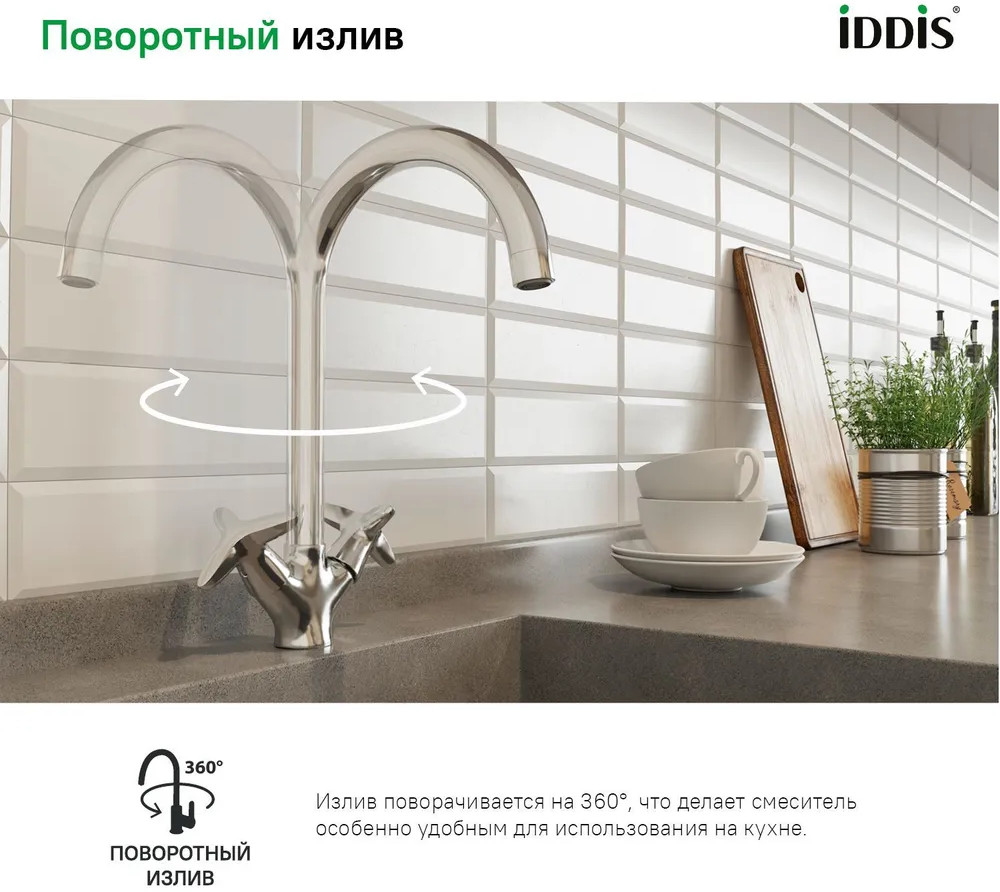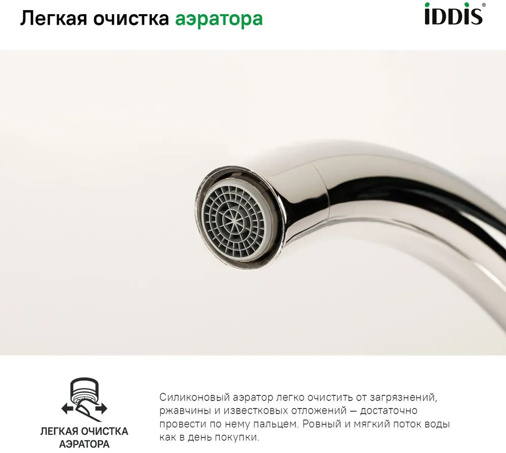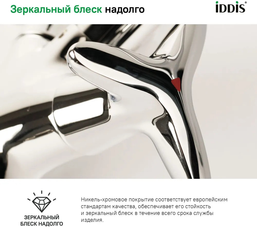 Смеситель для кухни Iddis изготовлен из высококачественной первичной латуни, прочной, безопасной и стойкой к коррозии. Инновационные технологии литья и обработки латуни, а также увеличенная толщина стенок смесителя обеспечивают его стойкость к перепадам давления и температур. Увеличенное никель-хромовое покрытие полностью соответствует европейским стандартам качества, обеспечивает его стойкость и зеркальный блеск в течение всего срока службы изделия. Благодаря гладкой внутренней поверхности смесителя, рассекателям в водозапорных механизмах и аэратору он имеет минимальный уровень шума. Большие треугольные ручки удобно открывать мыльной рукой. Гарантийный срок на корпус смесителя — 10 лет, на водозапорные механизмы — 5 лет.