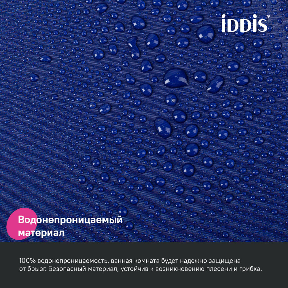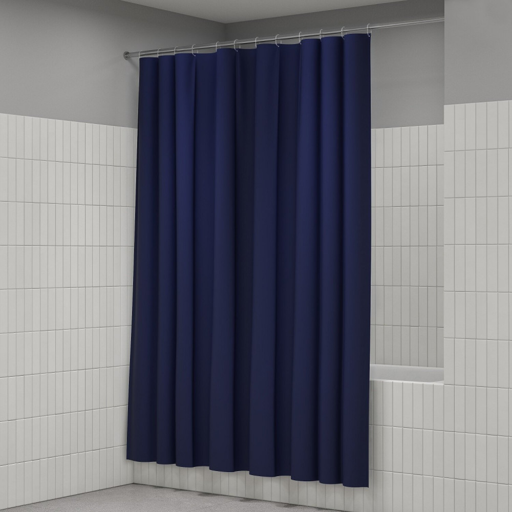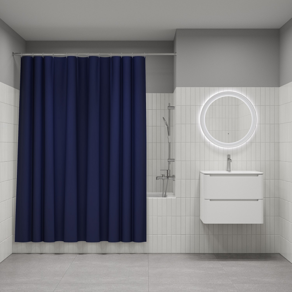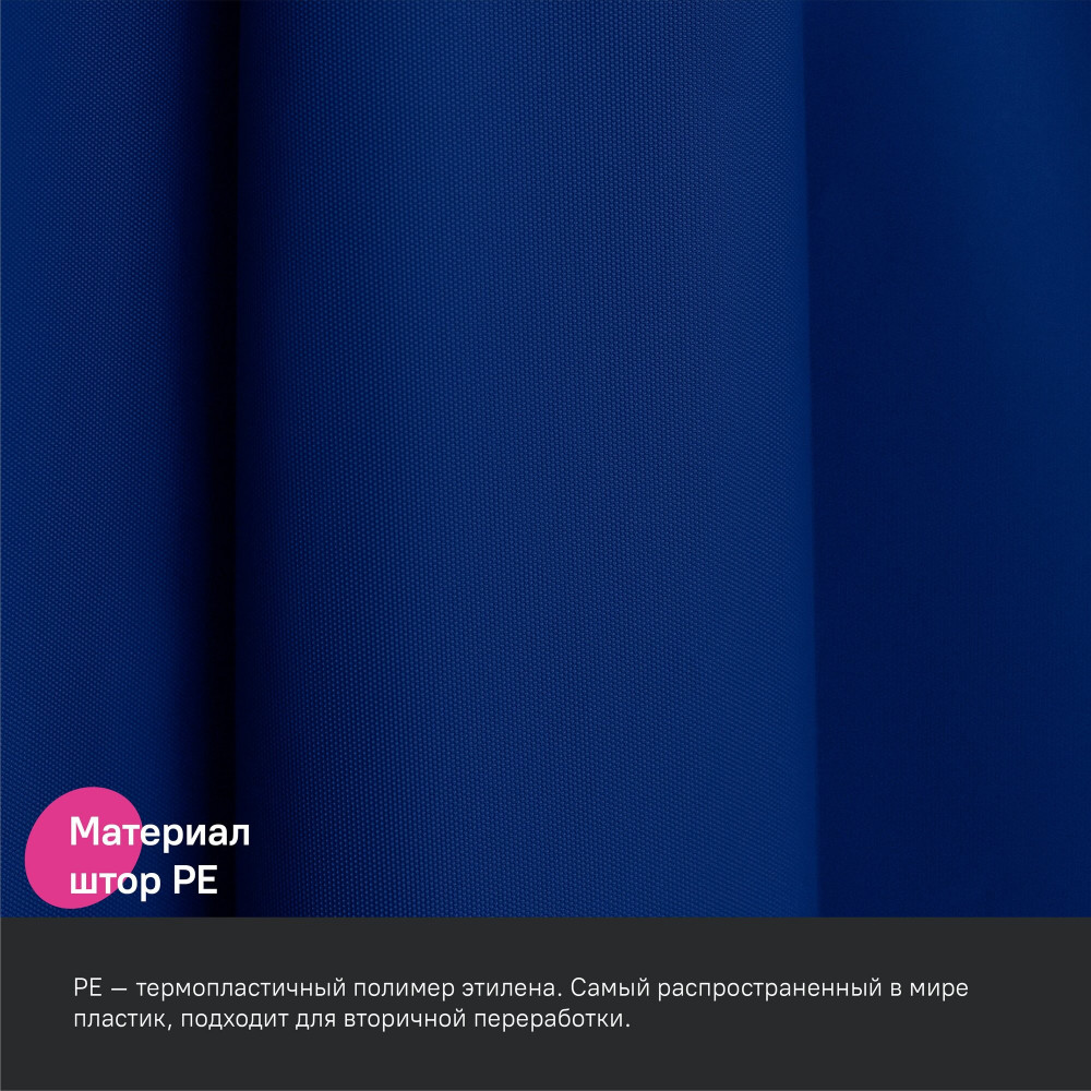 Однотонная непрозрачная штора для ванной глубокого синего цвет. Изготовлена из современного материала PE — мягкого, прочного, приятного на ощупь, экологичного и безвредного для здоровья термопластика (толщина 0.09 мм).