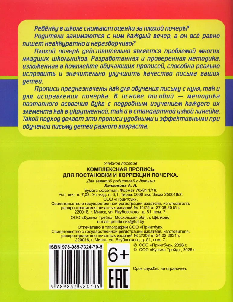 💳 Оплатить за товар можно при получении 🇰🇿 Есть бесплатная доставка по Казахстану от 1 дня 🎁 Копите бонусы с каждой покупки Ребенку в школе снижают оценйи за плохой почерк? Родители занимаются с ним каждый вечер, а он всё равно пишет неаккуратно и неразборчиво? Плохой почерк действительно является проблемой многих младших школьников. Разработанная и проверенная методика, изложенная в комплекте обучающих прописей, способна реально исправить и значительно улучшить качество письма ваших детей. Прописи предназначены как для обучения письму с нуля, так и для исправления почерка. В основе пособий — методика поэтапного освоения букв с подробным изучением каждого их элемента как в укрупненной, так и в стандартной узкой линейке. Такой подход делает эти прописи удобными и эффективными при обучении письму детей разного возраста. |