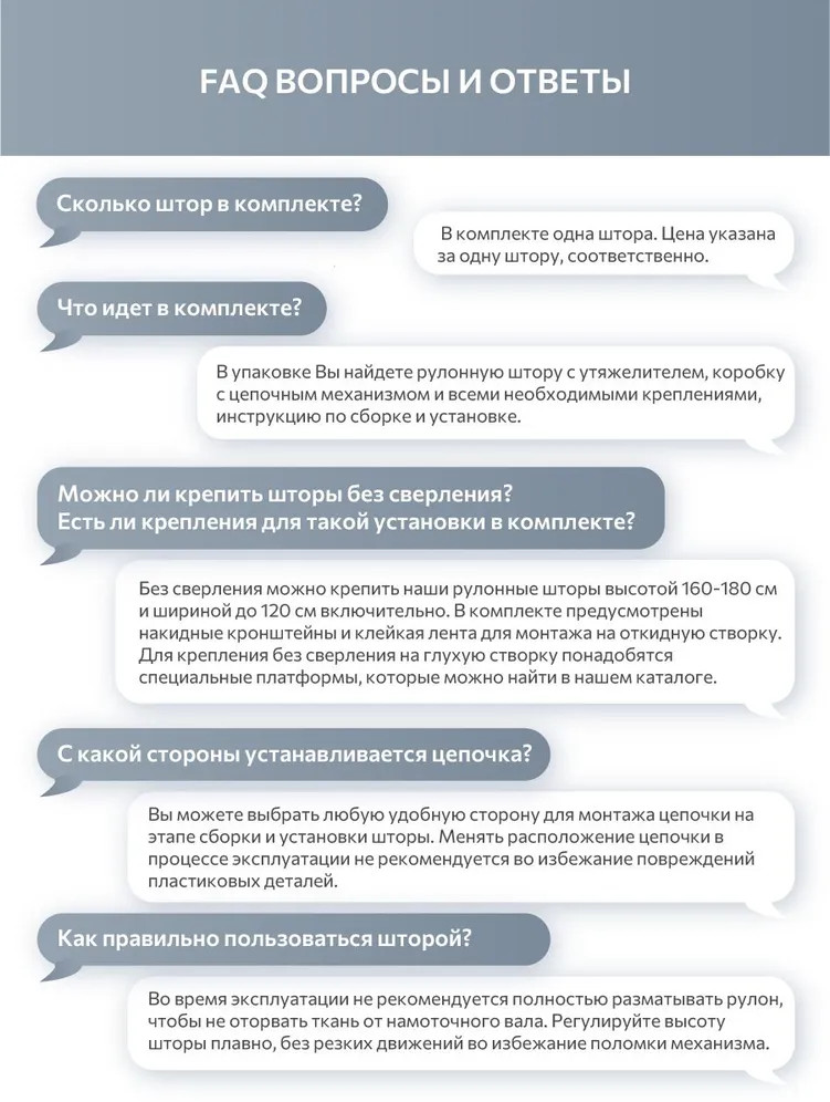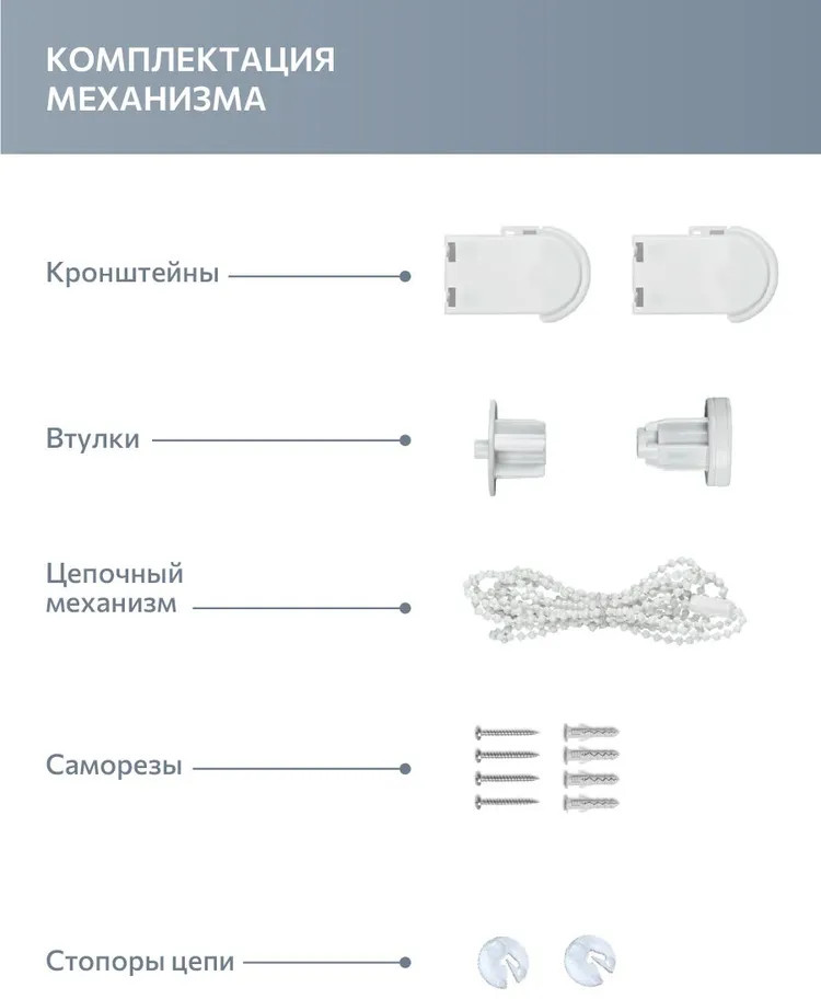 В комплект входит: рулонная штора в сборе: металлический вал (D25 мм), ткань, вшитый пластиковый утяжелитель, механизм в сборе (D25 мм), пластиковая цепочка управления, комплект дюбелей и саморезов, инструкция по установке.