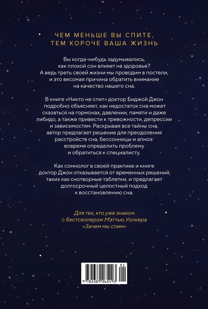 💳 Оплатить за товар можно при получении 🇰🇿 Есть бесплатная доставка по Казахстану от 1 дня 🎁 Копите бонусы с каждой покупки Серия: Научный интерес Треть своей жизни мы проводим в постели — весомая причина следить за качеством сна. В книге «Никто не спит» доктор Джон исследует проблемы со сном, включая бессонницу, апноэ и нарколепсию. Он подробно рассматривает влияние сна на здоровье и весь организм: гормоны, давление, память, набор веса, либидо и т. д. Доктор Биджой Джон подчеркивает, что расстройство сна часто связано с психологическими проблемами, такими как тревожность, депрессия и зависимость. Книга предлагает исчерпывающее пошаговое руководство, которое поможет понять: требуется им незначительная корректировка своих привычек сна или полная перестройка. |