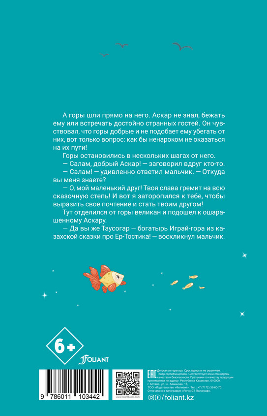 💳 Оплатить за товар можно при получении 🇰🇿 Есть бесплатная доставка по Казахстану от 1 дня 🎁 Копите бонусы с каждой покупки «Доброжелательный Аскар» — увлекательная сказка о казахском мальчике, оказавшемся в мире его любимых сказок. Герои Пушкина, Ханса Кристиана Андерсена, братьев Гримм, Сельмы Лагерлёф, персонажи сказок разных народов мира, хорошо знакомые Аскару по книгам, теперь становятся его настоящими друзьями. Путешествуя по удивительному сказочному миру, он спас Золотую рыбку, оживил Стойкого оловянного солдатика с его прелестной танцовщицей, пожил в замке Снежной королевы, переврал самого барона Мюнхгаузена, сдружился с богатырями из казахских сказок... В книгу, адресованную юным читателям, вошли все пять частей сказки об Аскаре: «Доброжелательный Аскар», «Новые друзья доброго Аскара», «Нападение злодеев», «Аскар и Анаконда», «Галлий и Геоло». |