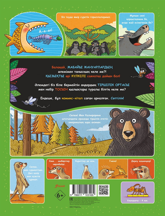 💳 Оплатить за товар можно при получении 🇰🇿 Есть бесплатная доставка по Казахстану от 1 дня 🎁 Копите бонусы с каждой покупки Балақай, жабайы жануарлардың құпияға толы тылсым тіршілігімен танысуға дайын бол! Қолыңдағы комикс-кітаптың беттерінен ғаламшарымыздағы түрлі тіршілік орталарын мекендейтін аю, балық, бақа, маймыл, сурикат, кесіртке, жарғанат сияқты алуан түрлі аң құс пен жәндіктерді кездестіресің. Титтей өрмекшіден әлемдегі ең алып тіршілік иесі — көк китке дейін жорғалайтын, өрмелейтін, ұшатын және жүзетін жануарлар жасырын сырларын қызылды-жасылды суреттер арқылы паш етеді. |