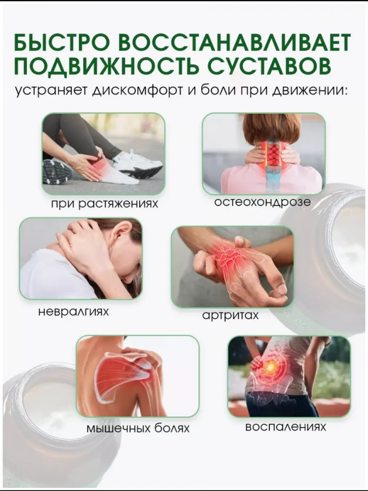 Мазь для суствов быстро и эффективно снижает болевые ощущения в суставах, позволяя вернуться к активной жизни. Способствует снижению воспаления и отечности. Основа рецептуры мази — это древние секретные ингредиенты, которые на протяжении веков использовались для лечения и восстановления суставов. Регулярное применение продукта помогает улучшить подвижность и гибкость суставов, способствуя более свободному и легкому движению.
