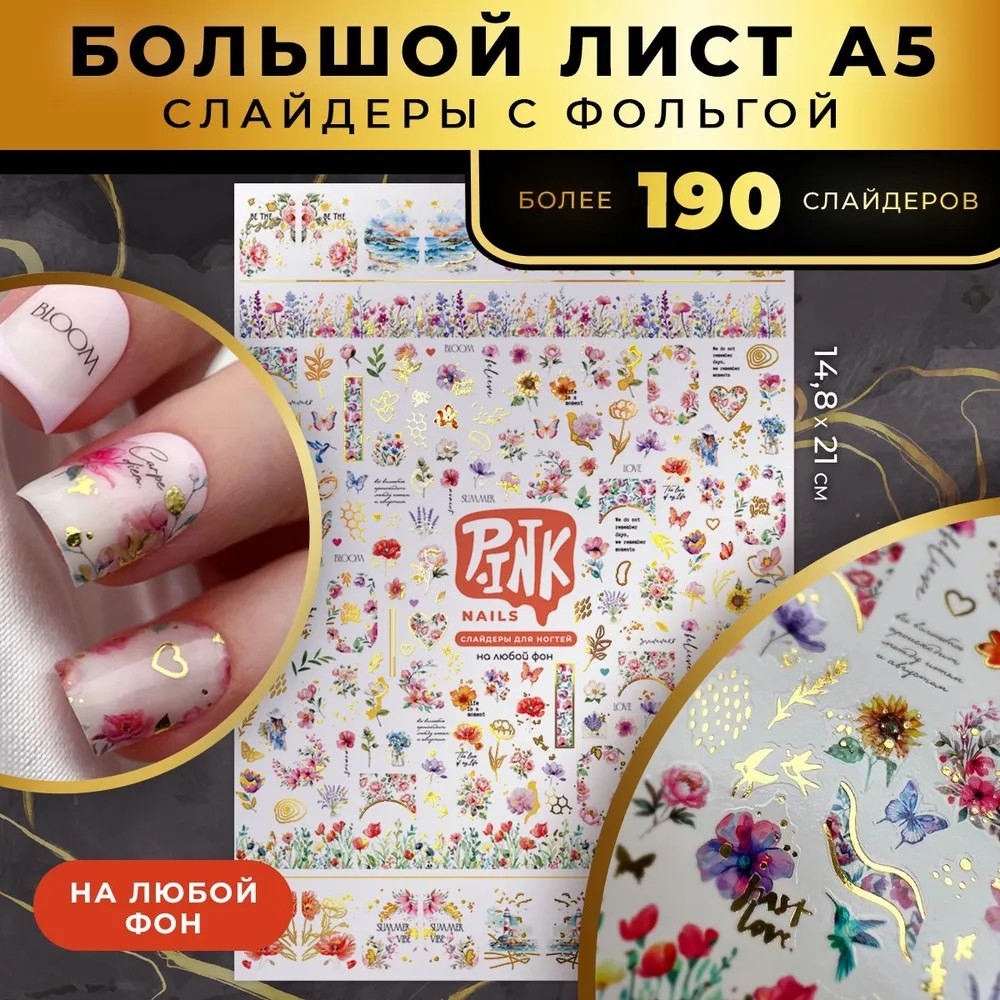 Pink Nails Слайдеры для ногтей с фольгой «Лето 2»В данный момент этот товар отсутствует в продаже. Возможно, у нас найдется аналогичный или похожий товар здесь. Фольгированные слайдеры — новый тренд в декоре ногтей. Это блестящие наклейки, которые сделают ваш маникюр модным и красивым. Рисунки с использованием фольги есть в разном дизайне: абстракция с золотом и серебром, космос, металлизированные мазки, переводилки — голограммы, осенние, весенние, зимние и летние мотивы, геометрия, акварель, листья, бабочки, цветы и травы в цвете металлик, астрология и символы, линии, волны и трещины, готическая символика и романтическая. Nail декор для маникюра и педикюра состоит из бумажной основы и ультратонкой пленки с рисунком, которая идеально ложится на ногтевую пластину с любым покрытием. Размер листа слайдера — 14.8×21 см. На каждом листе от 250 до 400 переводных наклеек. По размеру рисунки подойдут как для взрослых женщин, так и для девочек. |