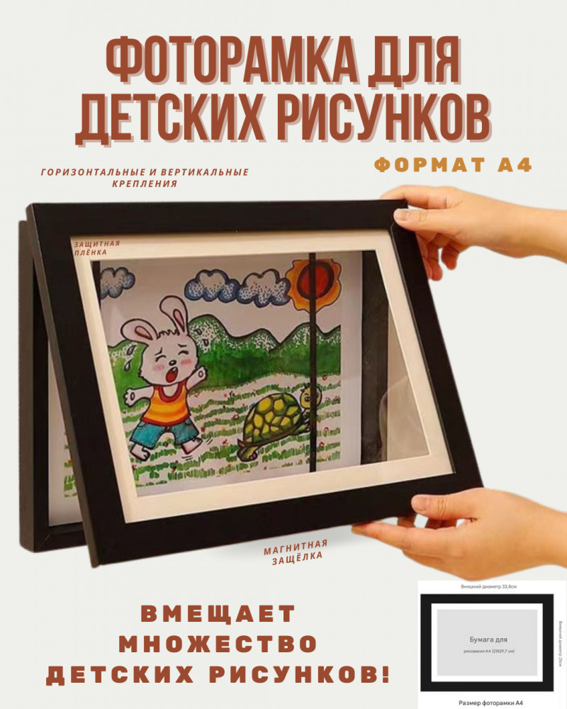 Рамка для детских рисунков с фронтальной крышкой. Эта стильная и удобная рамка предназначена для демонстрации детских рисунков и других творческих работ. Главная особенность — откидывающаяся фронтальная крышка, которая позволяет легко заменять изображения без необходимости снимать рамку со стены. Рамка выполнена в современном минималистичном дизайне и станет отличным дополнением интерьера детской комнаты или творческого уголка.