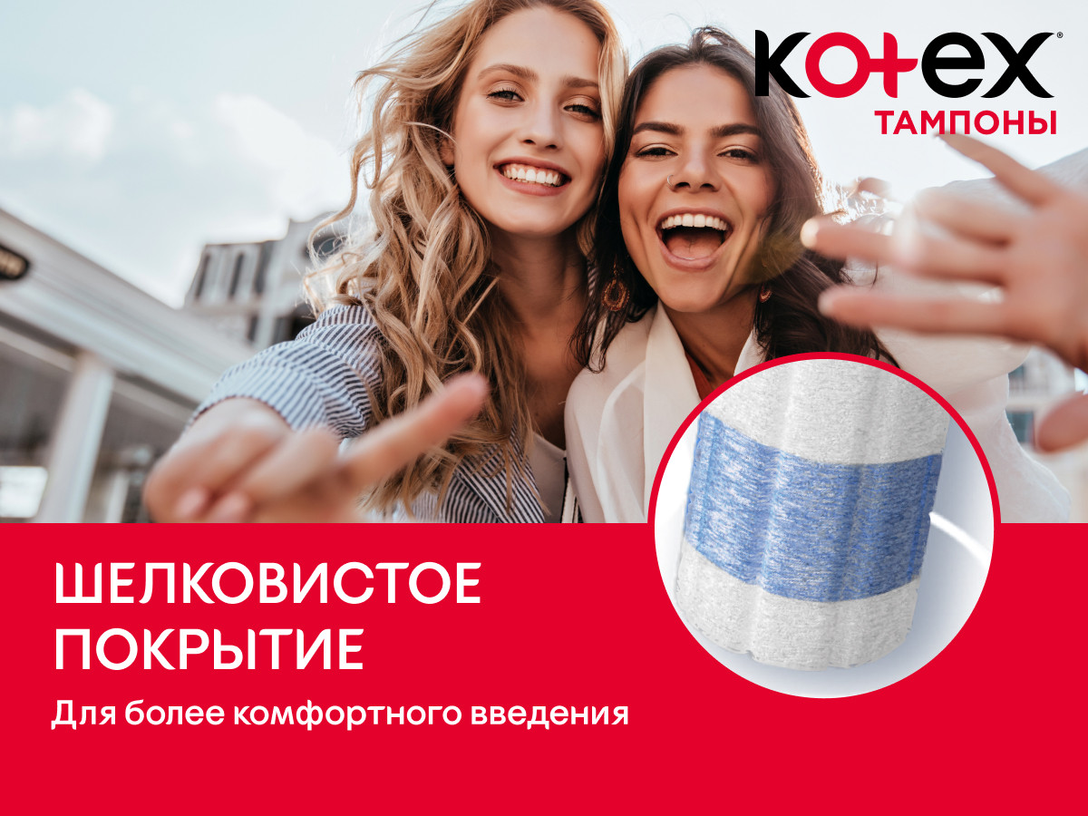 Тампоны Kotex Супер созданы специально для надёжной защиты в дни обильных менструальных выделений. Они гарантируют максимально комфортное введение благодаря поверхности SilkyCover, а гидрофильные волокна Ultra Sorb в специальной голубой зоне быстро впитывают влагу, удерживают ее внутри и обеспечивают экстра защиту до 0% протеканий и до 100% комфорта. Уникальная система открытия «Поверни-и-Открой» делает использование тампонов Котекс максимально простым и комфортным. Каждый тампон в индивидуальной упаковке — удобно брать с собой.