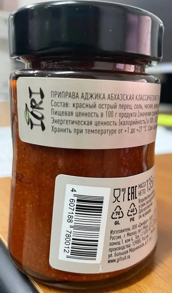 Iori Приправа «Аджика абхазская классическая»В данный момент этот товар отсутствует в продаже. Возможно, у нас найдется аналогичный или похожий товар здесь. 100% натуральная аджика. Без красителей и консервантов. Без глютена. Подходит к блюдам из печеной свинины, баранины, телятины. Служит идеальным маринадом для цыпленка «Табака» и крылышкам барбекю. Хорошо сочетается с соусами и супами. |