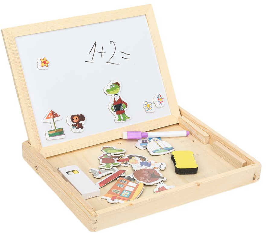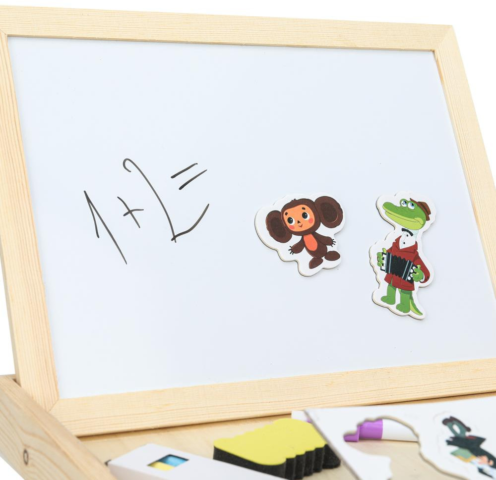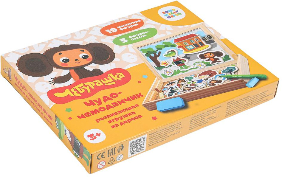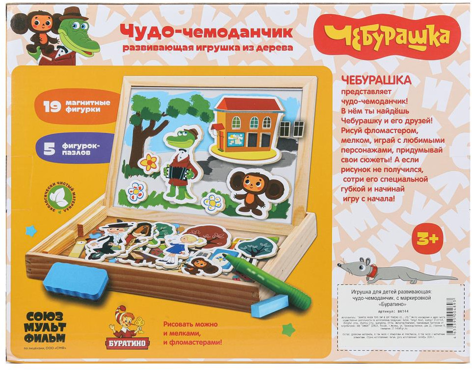 💳 Оплатить за товар можно при получении 🇰🇿 Есть бесплатная доставка по Казахстану от 1 дня 🎁 Копите бонусы с каждой покупки Серия: Союзмультфильм Чудо-чемоданчик «Чебурашка» из серии «Союзмультфильм» ТМ «Буратино» — отличная развивающая игра из дерева для маленьких поклонников одноимённого мультсериала. Маленький любознайка с удовольствием будет заниматься с этим интересным набором для рисования, используя магнитные фигурки героев из любимого мультфильма и рисуя самые разные картинки, используя как маркер, так и мелки. Занимательная игра непременно увлечёт ребёнка, поможет ему весело и с пользой провести время. Игра с доской для рисования ТМ «Буратино» будет способствовать развитию у детей: мелкой моторики, воображения и фантазии, творческих способностей, логического мышления, внимания и усидчивости. |