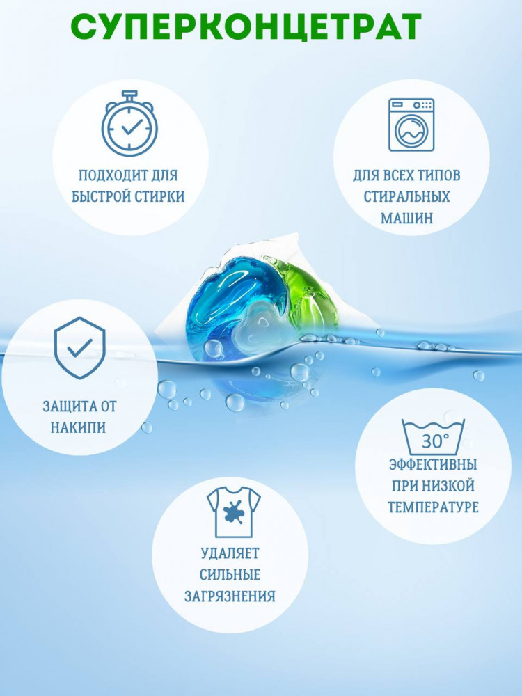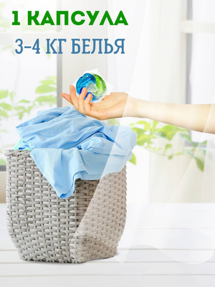 • простота в использовании: просто поместите капсулу в барабан стиральной машины вместе с бельем — и готово! Больше не нужно тратить время на измерение порошка или кондиционера.