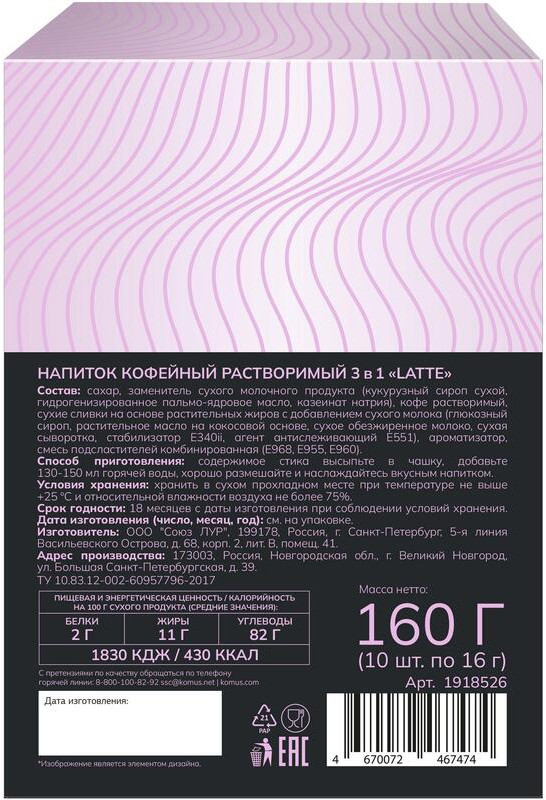 Деловой стандарт Кофе порционный растворимый «Latte 3 в 1»