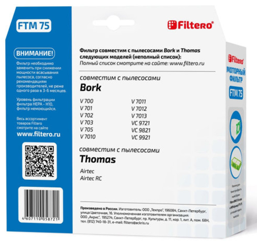 Торговая марка Filtero — лидер продаж пылесборников, НЕРА фильтров и аксессуаров для бытовых пылесосов в России в 2017 году. В ассортименте Filtero 60 различных мешков- пылесборников и более 30 видов НЕРА и других фильтров. Пылесборники Filtero совместимы с более чем 3500 разными моделями пылесосов, проданными в России за последние 20 лет, то есть практически покрывают весь ассортимент пылесосов, продаваемых в наших странах.