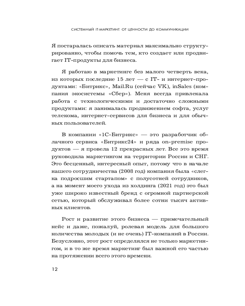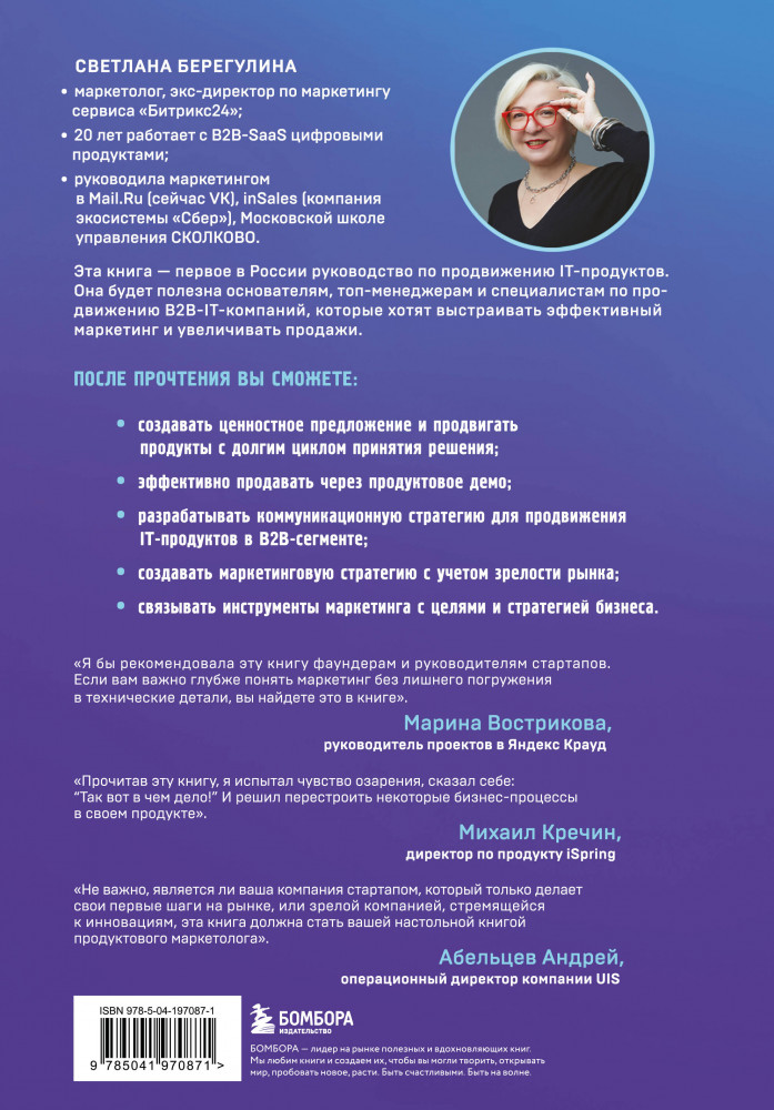 💳 Оплатить за товар можно при получении 🇰🇿 Есть бесплатная доставка по Казахстану от 1 дня 🎁 Копите бонусы с каждой покупки Серия: Атланты маркетинга Светлана Берегулина — маркетолог с 20-летним опытом работы с B2B-SaaS цифровыми продуктами. В течение 12 лет была директором по маркетингу в «1С-Битрикс», а также руководила маркетингом в Mail.Ru (сейчас VK), inSales (компания экосистемы «Сбер»), Московской Школе Управления СКОЛКОВО. Эта книга — первое в России руководство по продвижению IT-продуктов, написанное экс-директором по маркетингу сервиса «Битрикс24», раскрывающая, как правильно выстроить маркетинговую стратегию. Книга будет полезна основателям, топ-менеджерам и специалистам по продвижению B2B-IT-компаний, которые хотят выстраивать эффективный маркетинг и увеличивать продажи. |