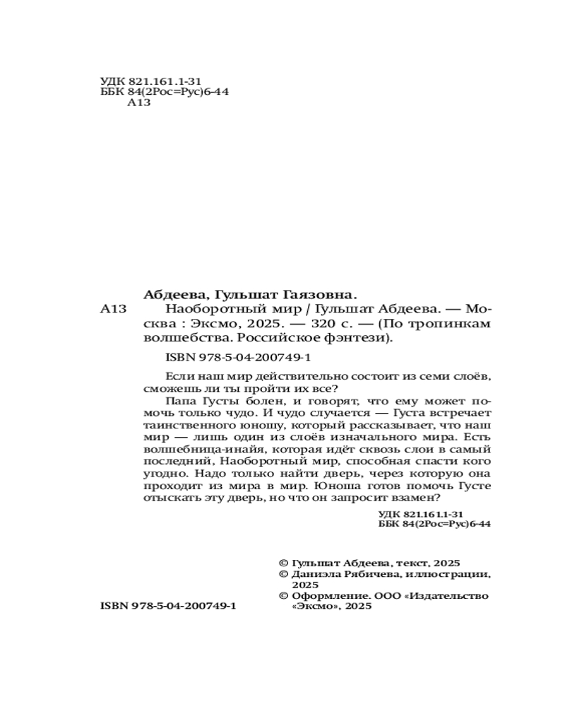 💳 Оплатить за товар можно при получении 🇰🇿 Есть бесплатная доставка по Казахстану от 1 дня 🎁 Копите бонусы с каждой покупки Серия: По тропинкам волшебства. Российское фэнтези Для поклонников необычных миров и «Девочки-капитана» Ольги Клушиной! Невероятное путешествие в поисках лекарства для отца! Путь Густы лежит через семь слоёв нашего мира. В каждом слое свои препятствия и загадки. Сможет ли девочка пройти через все испытания? И что она обретёт в конце пути? Гульшат Абдеева — современная российская писательница, лауреат множества конкурсов, среди которых Новая детская книга от «Росмэн», Международная молодёжная премия «Восхождение», Международная литературная премия имени В.П. Крапивина. Её романы в жанре детского детектива, фэнтези и фантастики пользуются заслуженным успехом. |