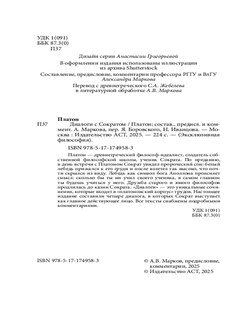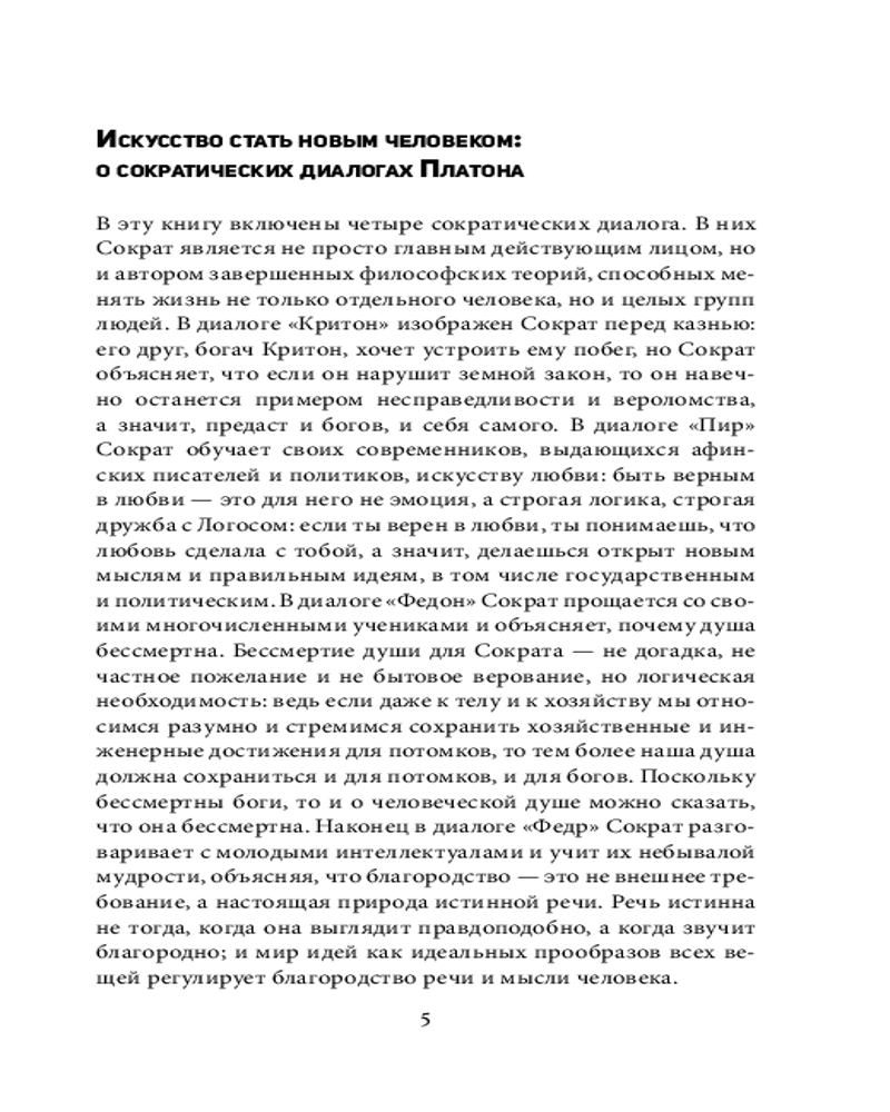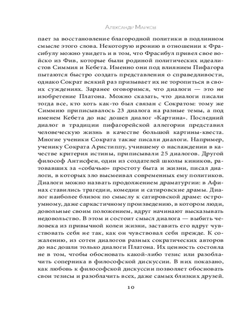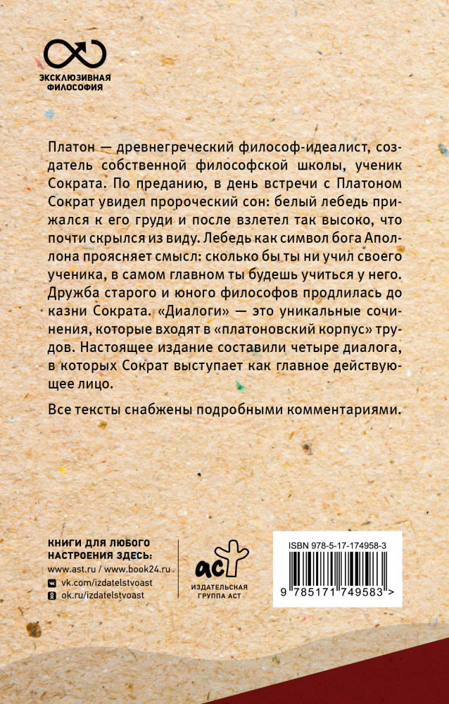 Диалоги с Сократом. С комментариями и иллюстрациямиВ данный момент этот товар отсутствует в продаже. Возможно, у нас найдется аналогичный или похожий товар здесь. Серия: Эксклюзивная философия Платон (ок. 428-348 гг. до н.э.) — древнегреческий философ-идеалист, создатель собственной философской школы, ученик Сократа. По преданию, в день встречи с Платоном Сократ увидел пророческий сон: белый лебедь прижался к его груди и после взлетел так высоко, что почти скрылся из виду. Лебедь как символ бога Аполлона проясняет смысл сна: сколько бы ты ни учил своего ученика, в самом главном ты будешь учиться у него. Дружба старого и юного философов продлилась до самой казни Сократа в 399 году до н.э. «Диалоги» — это уникальные сочинения, которые входят в так называемый «платоновский корпус» трудов, дошедших до наших дней. |