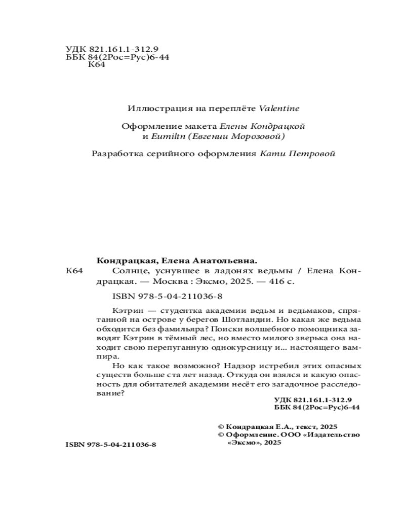 💳 Оплатить за товар можно при получении 🇰🇿 Есть бесплатная доставка по Казахстану от 1 дня 🎁 Копите бонусы с каждой покупки Серия: Young Adult. Книжный бунт. Фантастика Кэтрин — студентка академии ведьм и ведьмаков, спрятанной на острове у берегов Шотландии. Но какая же ведьма обходится без фамильяра? Поиски волшебного помощника заводят Кэтрин в темный лес, но вместо милого зверька она находит свою перепуганную однокурсницу и... настоящего вампира. Но как такое возможно? Надзор истребил этих опасных существ больше ста лет назад. Откуда он взялся и какую опасность для обитателей академии несет его загадочное расследование? |
