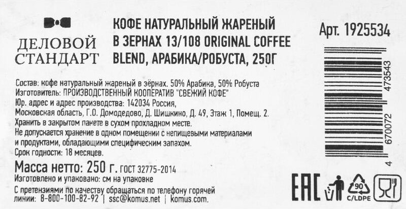 Деловой стандарт Кофе жареный в зернах «13/108 Original coffee blend»