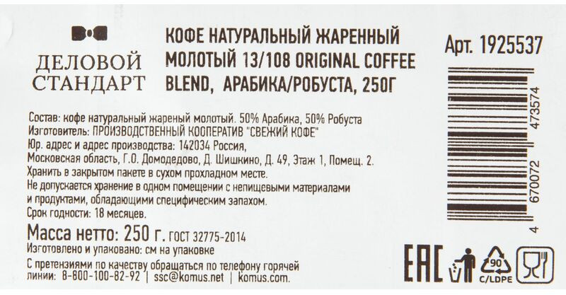 Деловой стандарт Кофе молотый «13/108 Original coffee blend»
