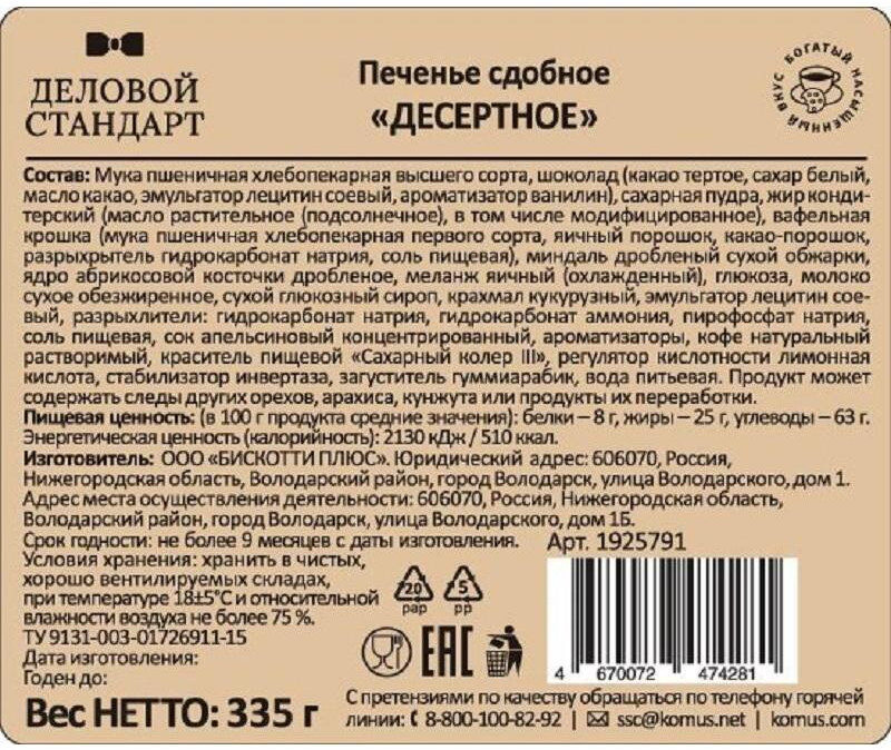 Мука пшеничная хлебопекарная высшего сорта, шоколад (какао тёртое, сахар белый, масло какао, эмульгатор лецитин соевый, ароматизатор ванилин), сахарная пудра, жир кондитерский (масло растительное (подсолнечное), в том числе модифицированное), вафельная крошка (мука пшеничная хлебопекарная первого сорта, яичный порошок, какао-порошок, разрыхлитель гидрокарбонат натрия, соль пищевая), миндаль дроблёный сухой обжарки, ядро абрикосовой косточки дроблёное, меланж яичный (охлаждённый), глюкоза, молоко сухое обезжиренное, сухой глюкозный сироп, крахмал кукурузный, эмульгатор лецитин соевый, разрыхлители: гидрокарбонат натрия, гидрокарбонат аммония, пирофосфат натрия, соль пищевая, сок апельсиновый концентрированный, ароматизаторы, кофе натуральный растворимый, краситель пищевой «Сахарный колер III», регулятор кислотности лимонная кислота, стабилизатор инвертаза, загуститель гуммиарабик, вода питьевая. Продукт может содержать следы орехов, арахиса, кунжута или продукты их переработки.