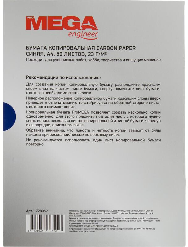 💳 Оплатить за товар можно при получении 🇰🇿 Есть бесплатная доставка по Казахстану от 1 дня 🎁 Копите бонусы с каждой покупки Серия: Engineer Подходит для рукописных работ, хобби, творчества и пишущих машинок. Для создания копии копировальную бумагу расположите красящим слоем вниз на чистом листе бумаги, сверху поместите лист бумаги, с которого необходимо снять копию. Неверное расположение копировальной бумаги красящим слоем вверх приведет к отпечатыванию текста/рисунка на обратной стороне листа, с которого снимают копию. Копировальная бумага ProMega позволяет создать несколько копий одновременно: для этого положите под один лист, с которого нужно снять копию, несколько листов копировальной и чистой бумаги, чередуя их в порядке, описанном выше. Обратите внимание, что яркость и четкость копий зависит от силы нажима при рисовании/письме по верхнему листу. Формат А4. 50 листов в папке. Не рекомендуется использовать один лист копировальной бумаги повторно. |