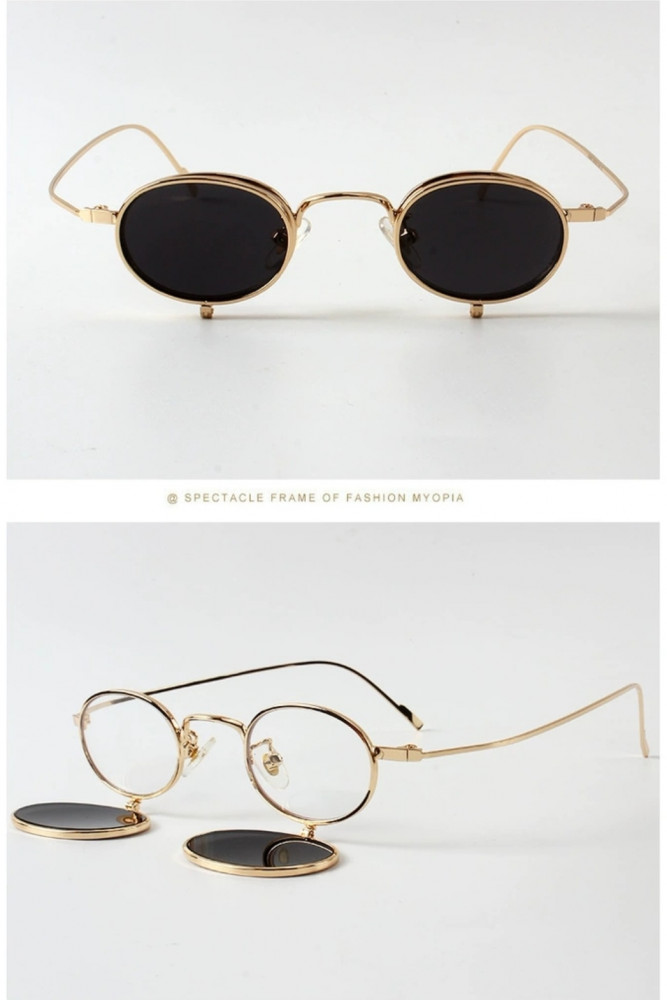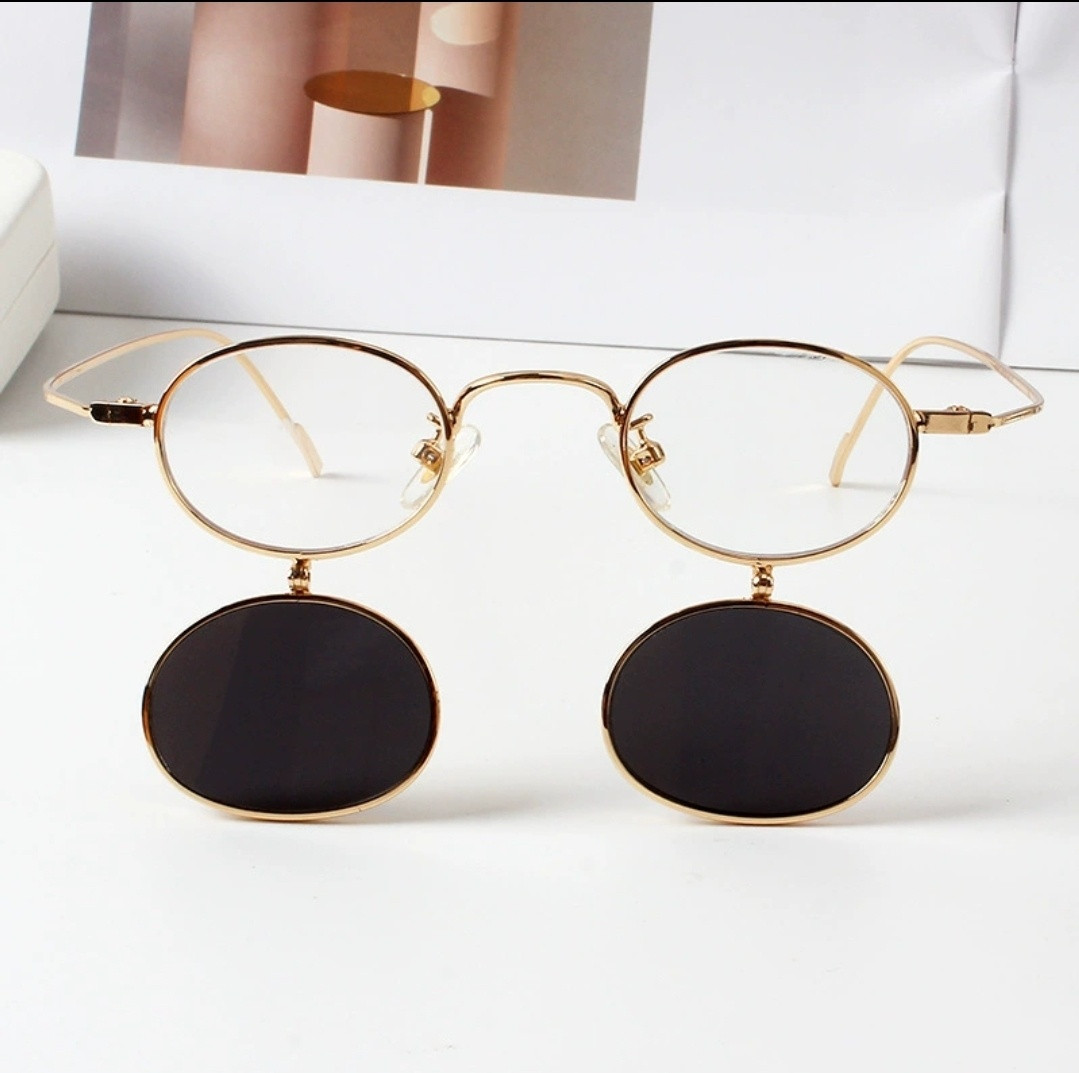Унисекс-очки с откидными солнцезащитными линзами — стиль и функциональность каждый день. Эти очки — идеальный выбор для тех, кто ценит оригинальные детали и практичность. Классическая овальная форма линз, прозрачные стекла и элегантная золотистая металлическая оправа делают модель универсальной. Особенность — откидные затемнённые линзы, которые можно легко опустить при ярком солнце и поднять обратно в помещении. Один аксессуар — два образа.