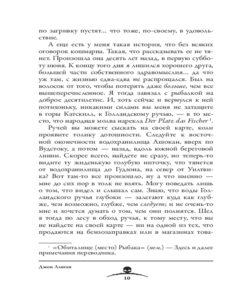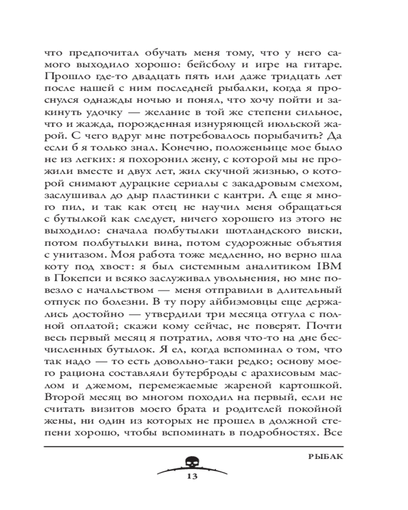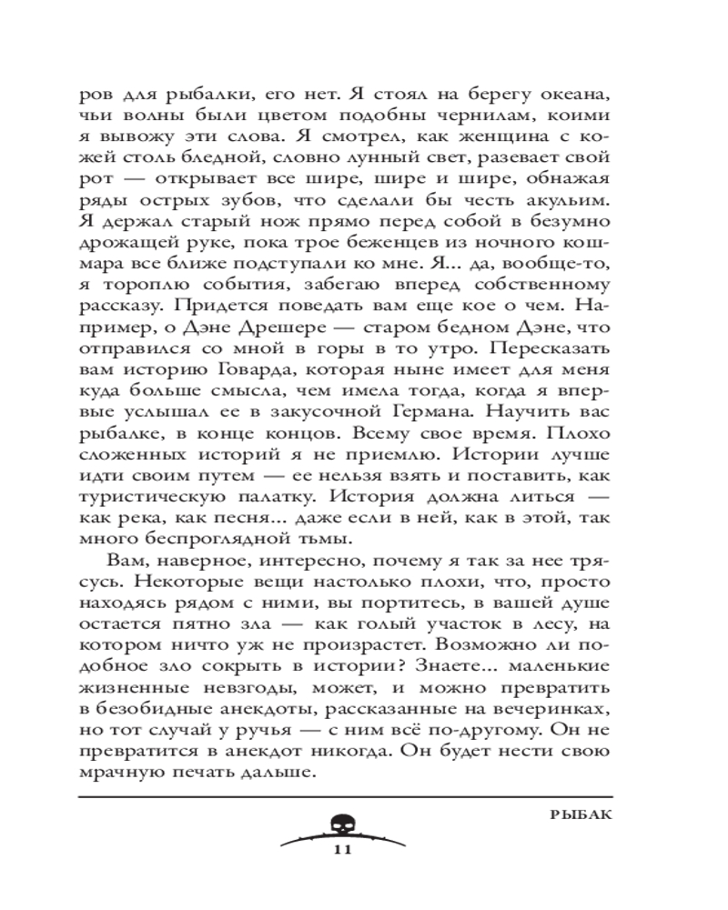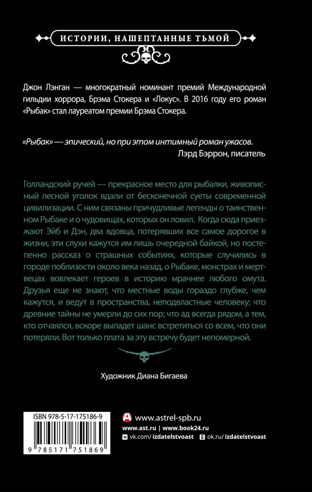 💳 Оплатить за товар можно при получении 🇰🇿 Есть бесплатная доставка по Казахстану от 1 дня 🎁 Копите бонусы с каждой покупки Серия: Истории, нашёптанные тьмой Голландский ручей — прекрасное место для рыбалки, живописный лесной уголок вдали от бесконечной суеты современной цивилизации. С ним связаны причудливые легенды о таинственном Рыбаке и о чудовищах, которых он ловил. Когда сюда приезжают Эйб и Дэн, два вдовца, потерявших все самое дорогое в жизни, эти слухи кажутся им лишь очередной байкой, но постепенно рассказ о страшных событиях, которые случились в городе поблизости около века назад, о Рыбаке, монстрах и мертвецах вовлекает героев в историю мрачнее любого омута. Друзья еще не знают, что местные воды гораздо глубже, чем кажутся, и ведут в пространства, неподвластные человеку; что древние тайны не умерли до сих пор; что ад всегда рядом, а тем, кто отчаялся, вскоре выпадет шанс встретиться со всем, что они потеряли. Вот только плата за эту встречу будет непомерной. |