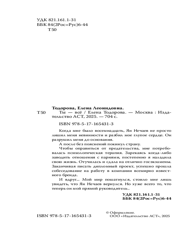 💳 Оплатить за товар можно при получении 🇰🇿 Есть бесплатная доставка по Казахстану от 1 дня 🎁 Копите бонусы с каждой покупки Серия: Твоя любовь Когда мне было восемнадцать, Ян Нечаев не просто лишил меня невинности и разбил мое глупое сердце. Он разрушил меня до основания. А после пояснений покинул страну. Чтобы оправиться от предательства, мне потребовалась психологическая терапия. Зарекаясь когда-либо заводить отношения с парнями, постепенно я наладила свою жизнь. Отучилась и сдала на отлично госэкзамены. Заканчивая писать дипломный проект, успешно прошла собеседование на работу в компании всемирно известного бренда. И вдруг... Мой мир пошатнулся, стоило мне лишь увидеть, что Ян Нечаев вернулся. Но хуже всего то, что теперь он мой прямой руководитель... |