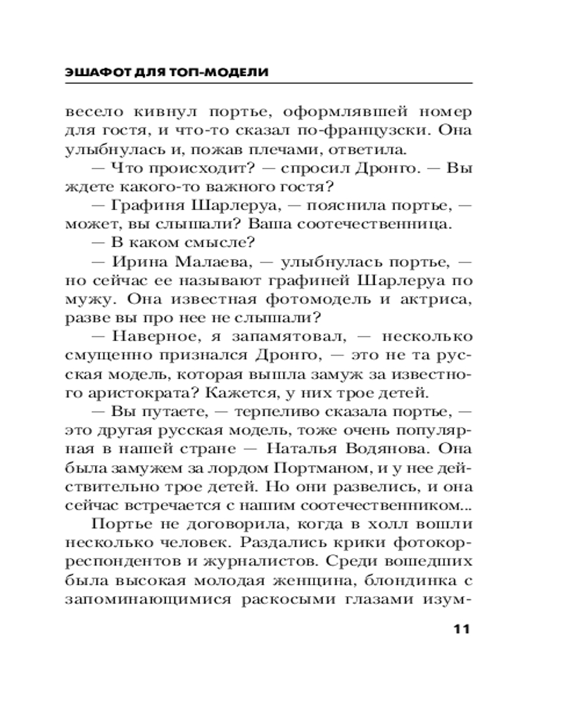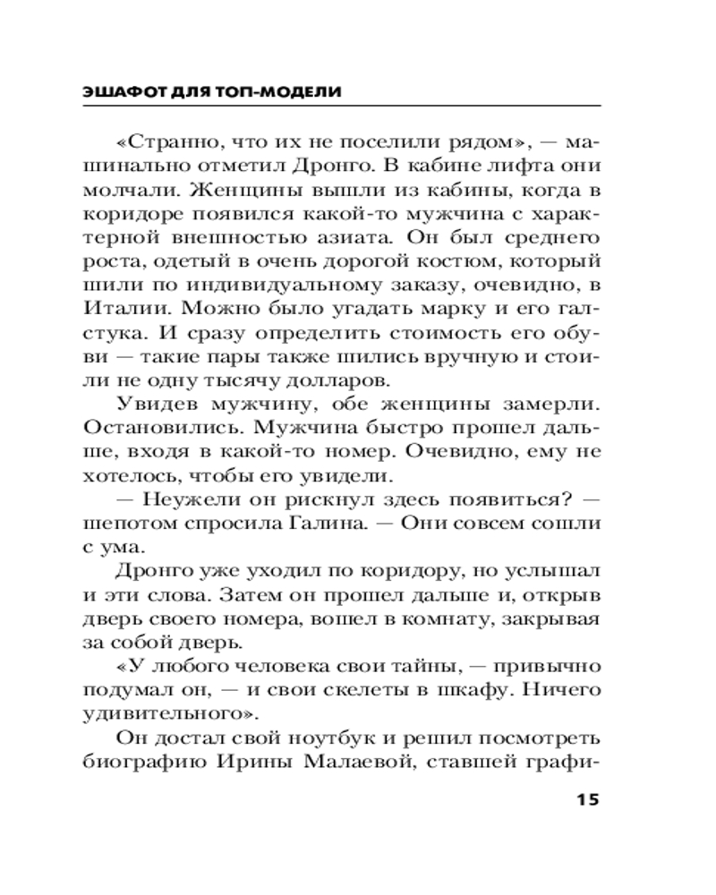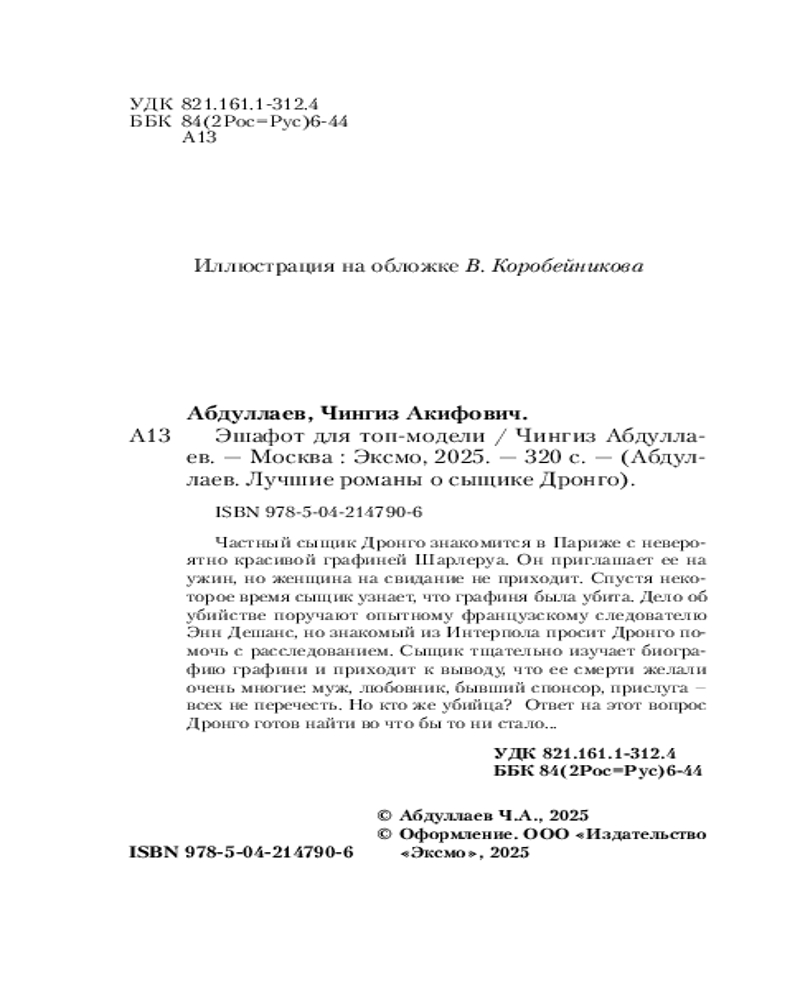 💳 Оплатить за товар можно при получении 🇰🇿 Есть бесплатная доставка по Казахстану от 1 дня 🎁 Копите бонусы с каждой покупки Серия: Абдуллаев. Лучшие романы о сыщике Дронго. Эконом (обложка) Частный сыщик Дронго знакомится в Париже с невероятно красивой графиней Шарлеруа. Он приглашает ее на ужин, но женщина на свидание не приходит. Спустя некоторое время сыщик узнает, что графиня была убита. Дело об убийстве поручают опытному французскому следователю Энн Дешанс, но знакомый из Интерпола просит Дронго помочь с расследованием. Сыщик тщательно изучает биографию графини и приходит к выводу, что ее смерти желали очень многие: муж, любовник, бывший спонсор, прислуга — всех не перечесть. Но кто же убийца? Ответ на этот вопрос Дронго готов найти во что бы то ни стало... |