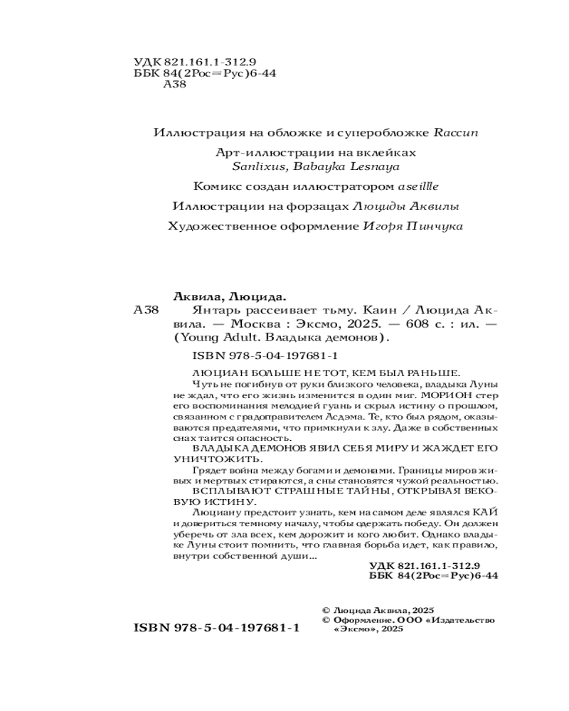 💳 Оплатить за товар можно при получении 🇰🇿 Есть бесплатная доставка по Казахстану от 1 дня 🎁 Копите бонусы с каждой покупки Серия: Young Adult. Владыка демонов Заключительная часть уникальной серии фэнтези по мотивам китайских новелл — «Янтарь рассеивает тьму» от популярной писательницы в российском фандоме Люциды Аквилы. Роман о богах, демонах, заклинателях и терзающих души мрачных тайнах. В издание будут включены новые бонусные главы, а также цветные вклейки с персонажами и потрясающий комикс от художницы aseillle! Книга выпускается с суперобложкой, украшенной фольгой. |