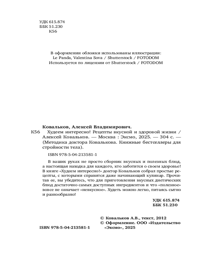 💳 Оплатить за товар можно при получении 🇰🇿 Есть бесплатная доставка по Казахстану от 1 дня 🎁 Копите бонусы с каждой покупки Серия: Методика доктора Ковалькова. Книжные бестселлеры для стройности тела Доктор Ковальков — эксперт в вопросах снижения веса, основатель собственной клиники и врач, разработавший уникальную методику похудения. Его книга «Худеем интересно!» — прикладное руководство с полезными рецептами и рекомендациями, которое поможет составить правильный рацион и научиться готовить легко, чтобы стать легче! А также пополните свою поваренную книгу сотней новых рецептов блюд, которые принесут не только удовольствие, но и здоровье! |