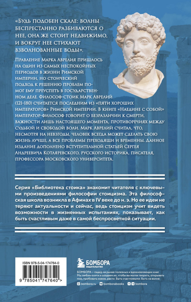 Марк Аврелий — римский император, вошедший в историю как «философ на троне». Он считается последним из пяти хороших императоров, после его смерти ему наследовал его недостойный сын, а некогда великий Рим был ввергнут в долгую череду войн между различными претендентами, после которой империя так и не оправится. «Наедине с собой» — сборник афористических мыслей императора Марка Аврелия в двенадцати «книгах» (небольших главах), написанный им на греческом языке (койне) в 70-е годы II в. н. э.