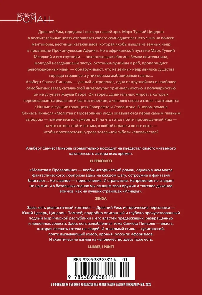 💳 Оплатить за товар можно при получении 🇰🇿 Есть бесплатная доставка по Казахстану от 1 дня 🎁 Копите бонусы с каждой покупки Серия: Большой роман Древний Рим, середина I века до нашей эры. Марк Туллий Цицерон в воспитательных целях отправляет своего семнадцатилетнего сына на поиски мантикоры, вестницы катаклизмов, которая якобы вышла из земных недр в провинции Проконсульская Африка. Но в африканской пустыне Марк Туллий Младший и его спутники — поклоняющаяся богине Земли воительница, молодой незадачливый пастух, охотники-пунийцы и раб, пропагандист революционных идей, — обнаруживают, что из недр явились существа гораздо страшнее и у них весьма амбициозные планы... |