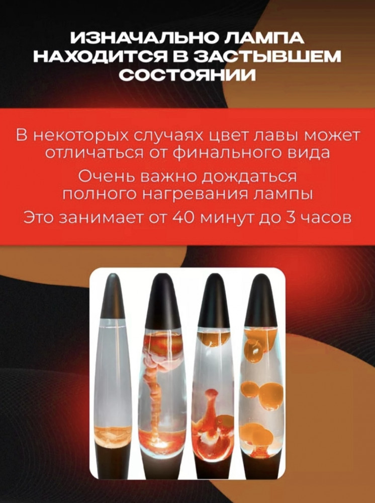 Обратите внимание! Первый запуск лампы может занять до 3 часов — это необходимо для разогрева воска. При последующих включениях лампа будет работать быстрее.