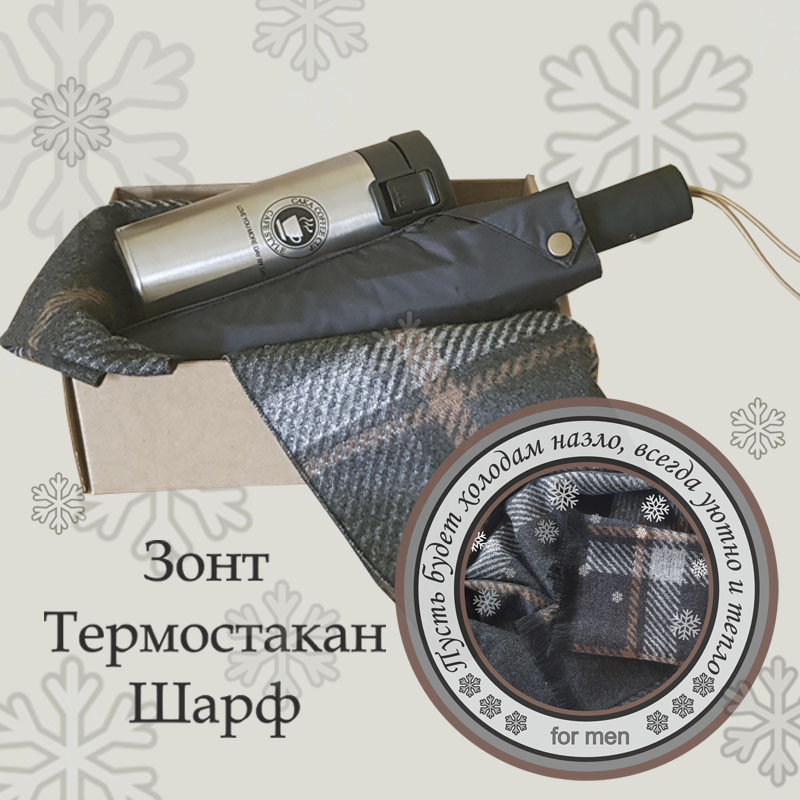 Выбрать подходящий подарок для мужчины — задача не из простых. Хочется, чтобы он был не только красивым и стильным, но и практичным, чтобы приносил радость в использовании и напоминал о внимательном отношении и хорошем вкусе дарителя. Представляем универсальный подарочный набор, в состав которого входят три необходимых и функциональных предмета: автоматический мужской зонт, тёплый шарф и практичный термостакан. Зонт защитит от дождя и солнца, а лёгкий и тёплый шарф, сотканный из смеси натуральной шерсти и вискозы с добавлением синтетических волокон, надолго сохранит форму и цвет. Термостакан из нержавеющей стали с двойными стенками выполняет функцию небольшого термоса — он надёжно удерживает температуру напитков в течение нескольких часов. Для наполнения достаточно отвернуть крышку, а пить удобно через встроенный клапан и питейник с фильтрующей мембраной, которая не пропускает частицы чая, кофе или кусочки льда. Шарф и термостакан аккуратно упакованы в подарочную коробку с тёплым пожеланием: «Пусть будет холодам назло, всегда уютно и тепло», а весь комплект, включая зонт, помещён в праздничный прозрачный пакет с нарядными репсовыми лентами на ручке. При необходимости содержимое легко проверить перед вручением подарка.