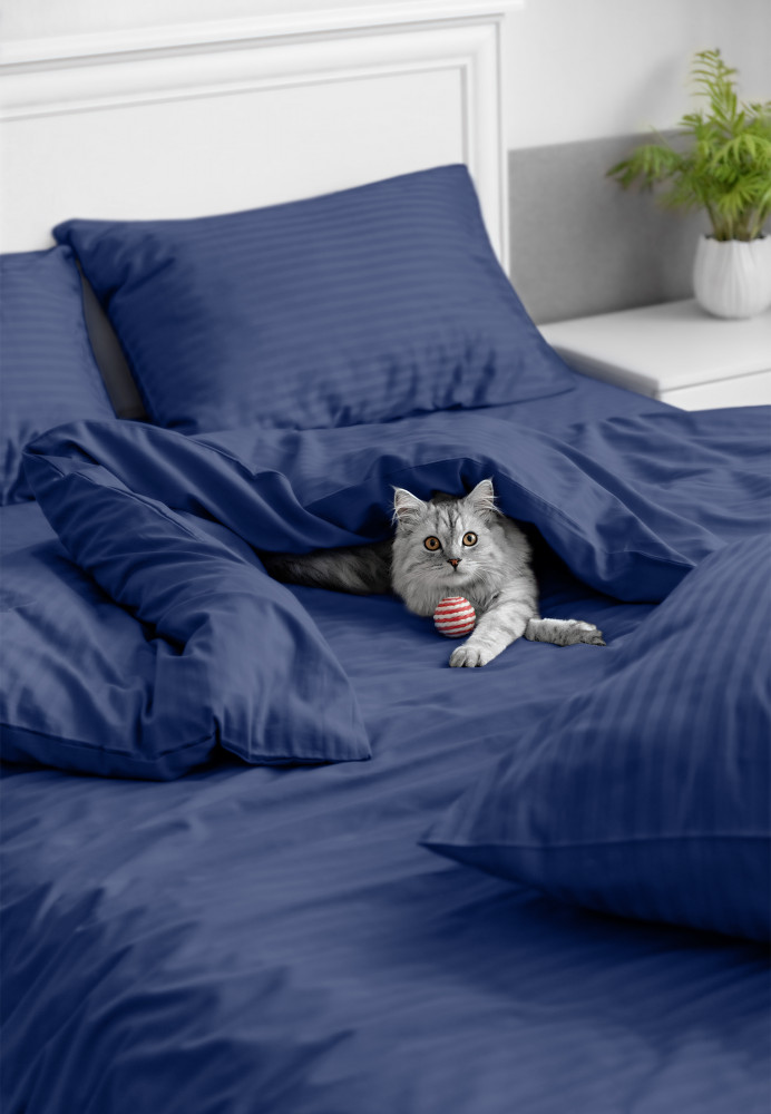 «Фирменный» признак страйпа — чередование на ткани полос матовой и блестящей фактуры. Страйп (stripe) и переводится с английского как «полоска». Такая «полосатая» структура делает страйп очень прочной и износостойкой тканью, которую можно стирать даже при высоких температурах. По ощущениям страйп самый теплый из всех видов ткани, а всё из-за сложного переплетения: ткань удерживает воздух и сохраняет тепло, выделяемое телом во время сна. В России только мы производим страйп и наносим на него дополнительный рисунок.