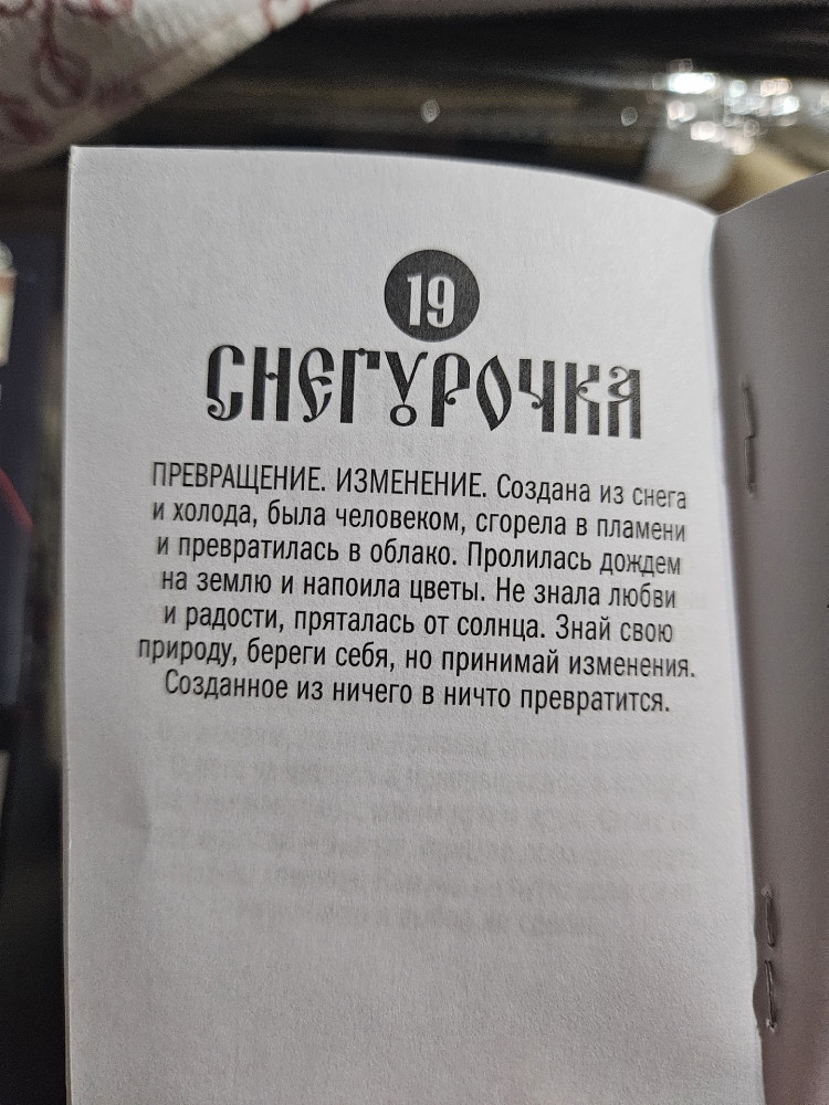 💳 Оплатить за товар можно при получении 🇰🇿 Есть бесплатная доставка по Казахстану от 1 дня 🎁 Копите бонусы с каждой покупки Серия: Мастерская жизни. Авторская серия Светланы Патрушевой «Архетипы русских сказок» — это метафорические ассоциативные карты от преподавателя психологии, арт-терапевта и автора бестселлера «Психология русской сказки» Светланы Патрушевой. Образы из сказок помогут иначе взглянуть на свои жизненные ситуации и решения. Внутри 50 карт с атмосферными иллюстрациями и простая инструкция с подробным описанием героя, предмета или места из сказок. А еще варианты вопросов и способы работы с картами. Спрашивайте у русских сказок и получайте ясные ответы из глубины веков. Пусть они станут для вас путеводными! |
