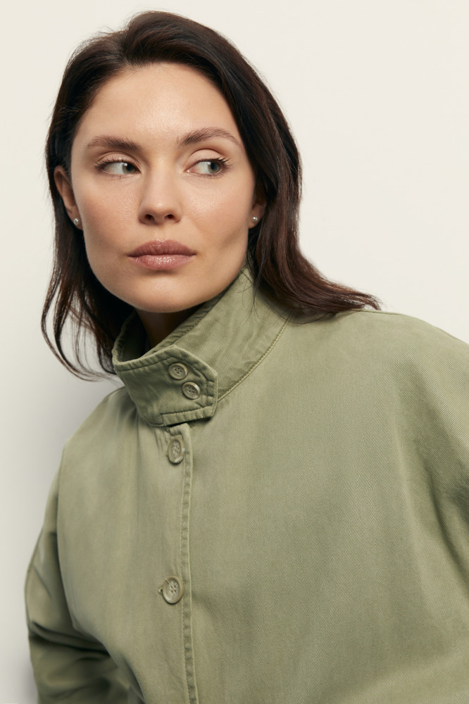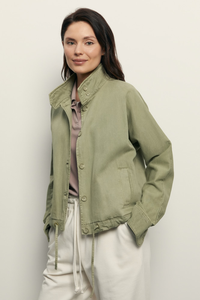 Легкий жакет из тенселя с воротником-стойкой. Для пошива изделия использовали джинсовый тенсель на основе 100% вискозы. Благодаря особому плетению фактура джинс тенселя напоминает классический деним. Однако полотно более легкое, с нежным бархатистым эффектом и обладает повышенной воздухопроницаемостью, что делает модель идеальным выбором для теплых дней. Полуприлегающий крой обеспечивает комфортную посадку, а кулиска по низу позволяет регулировать степень прилегания и создавать силуэт подходящего объема. Воротник-стойка добавляет модели элегантности и защитит шею от ветра. По бокам — удобные карманы. Застегивается на пуговицы в тон основной ткани.