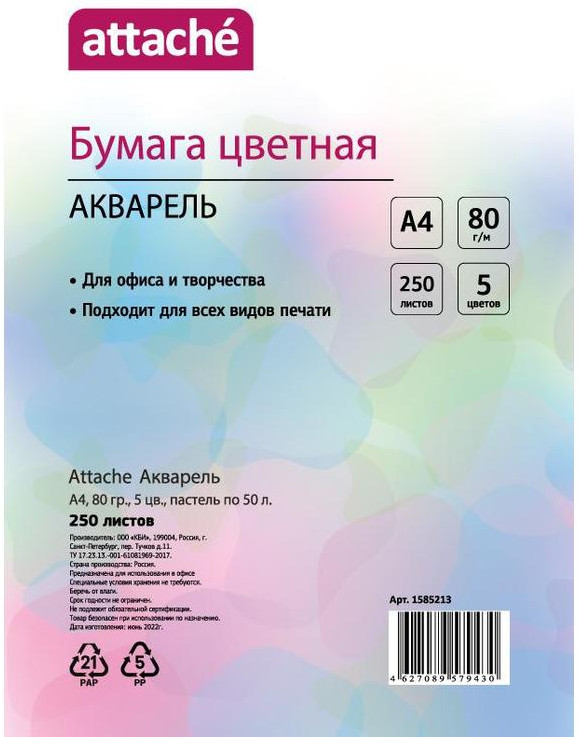 Attache Бумага цветная «Акварель»-25% +43