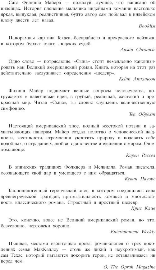 💳 Оплатить за товар можно при получении 🇰🇿 Есть бесплатная доставка по Казахстану от 1 дня 🎁 Копите бонусы с каждой покупки Весна 1849 года. Илаю МакКалоу было всего тринадцать, когда индейцы команчи напали на его дом в Техасе, убили мать и сестру, а его самого забрали с собой. Сообразительный и отчаянно храбрый Илай быстро привык к жизни среди индейцев и скоро стал одним из них. Не белый и не индеец, мальчик завис между двумя цивилизациями, уходящей и наступающей. Он сам должен отыскать свое место в мире, где приключения и трагедии сменяют друг друга с калейдоскопической быстротой. 1915 год. Питер МакКалоу придавлен чувством вины за происходящее вокруг него, за ту ярость, с какой люди выгрызают себе место под солнцем. Он полная противоположность отцу — он не действует, но созерцает и размышляет. Питер слишком рано явился в этот мир, где в цене лишь сила и напор. Середина двадцатого века. Джинни МакКалоу — несгибаемая леди, железной рукой управляющая богатейшей компанией Техаса, если не всей страны, глава мощной нефтяной империи. Ее мир — мир холодного расчета и стремительных реакций на политические новости. Но она не чувствует себя в нем своей. |