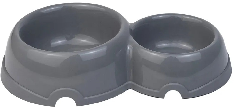 Миска для кошек и собак мелких пород. Выполнена в виде двух объединенных мисок на 200 мл и на 350 мл с декоративным обрамлением и полукруглым вырезом. Изготовлено из вторичного полипропилена. Подходит, как для сухого, так и для влажного корма.