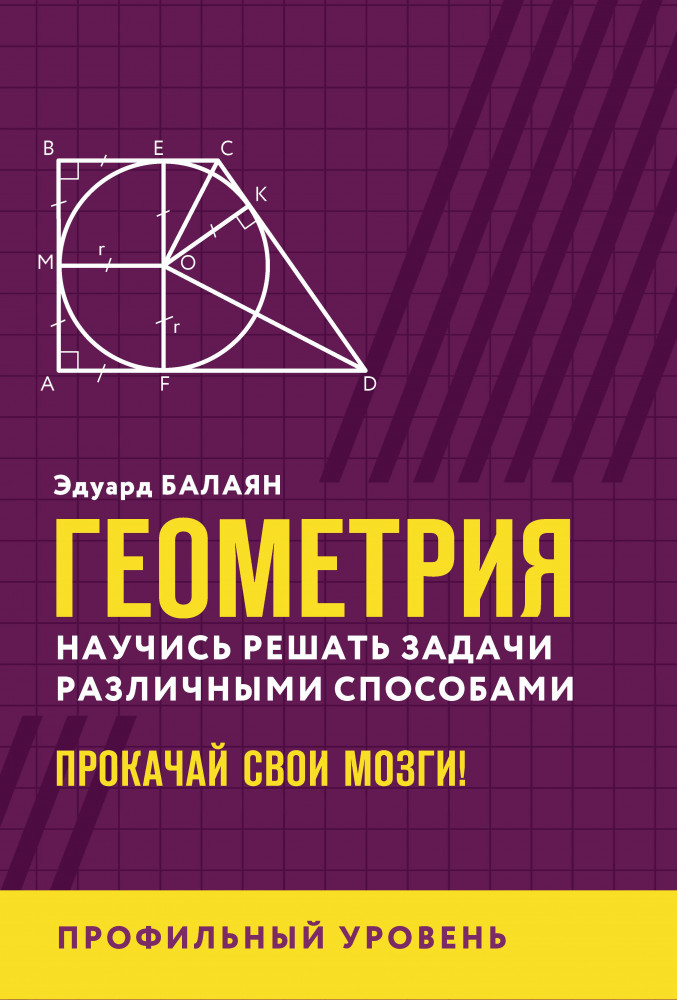 Геометрия. Научись решать задачи различными способами. Прокачай свои мозги! Профильный уровеньВ данный момент этот товар отсутствует в продаже. Возможно, у нас найдется аналогичный или похожий товар здесь. Серия: Большая перемена м Предлагаемая книга посвящена решению одной и той же задачи, но разными способами. Количество приведенных способов — от 2 до 13, при этом используются оригинальные идеи и методы решений, которые способствуют повышению уровня и качества знаний, необходимых для успешной сдачи ЕГЭ по математике профильного уровня и победы на олимпиадах различного уровня. Решение одной и той же задачи разными способами дает возможность полнее исследовать свойства геометрической фигуры и выявить наиболее простые решения. Найденный способ решения в дальнейшем нередко используется при решении более трудных задач. При этом ученик развивает свои творческие возможности, формирует познавательный интерес, вырабатывает исследовательские навыки. В книге три параграфа, из которых первые два содержат подробные решения и обоснования задач планиметрии. В конце второго параграфа приведены задачи для самостоятельного решения, к которым даны ответы. В третьем параграфе приводятся избранные задачи на применение формул Пифагора, которые лишь упоминаются в учебнике геометрии. Кроме того, в книге имеются краткие теоретические сведения по всему курсу геометрии 7-9 классов. Книга адресована учащимся 7-11 классов, абитуриентам, учителям математики, репетиторам и всем любителям математики. |