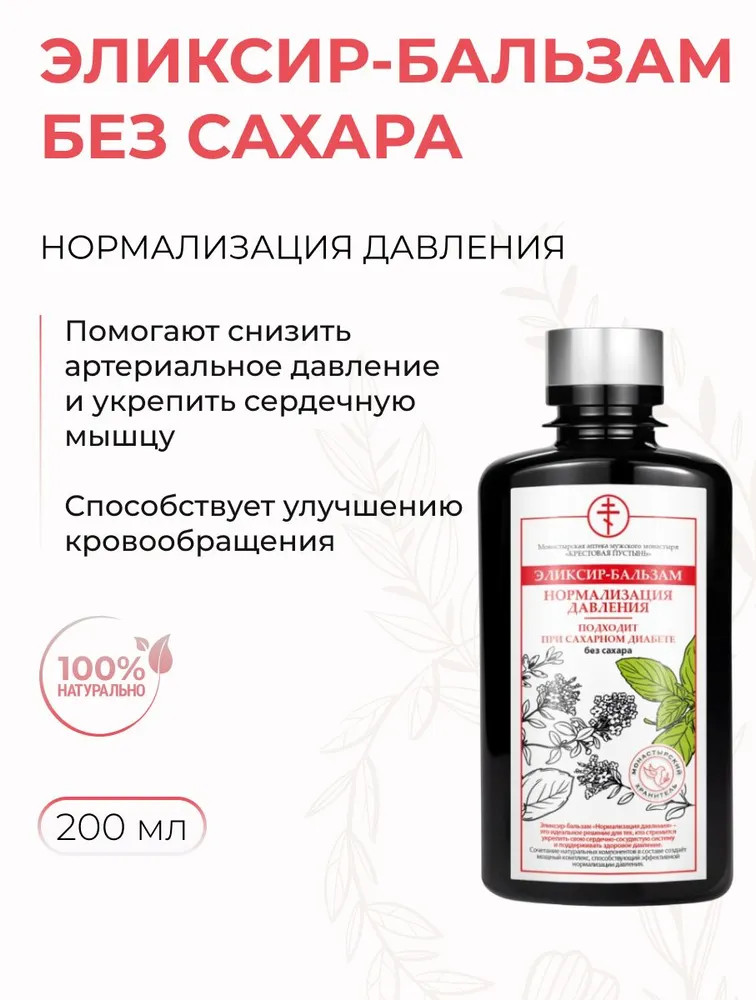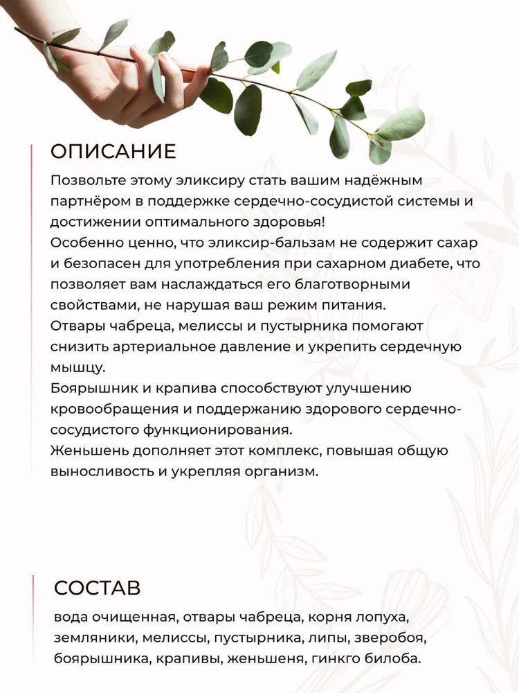 Эликсир представляет собой травяной бальзам, который способствует улучшению здоровья сердечно-сосудистой системы. Он основан на проверенных временем рецептах кавказских целителей. Продукт содержит лекарственные травы, такие как чабрец, мелисса и пустырник, которые помогают в контроле давления. Эти натуральные компоненты усиливают функцию сердца, укрепляя его мышцу.