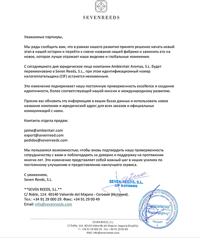 Внимание! Произошло изменение в названии фабрики: Ambientair Aromas, S.L. переименована в Seven Reeds, S.L., при этом сохраняются названия линеек, формул и идея бренда Ambientair.