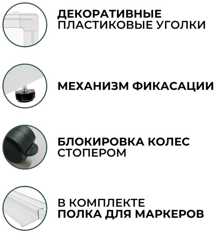 💳 Оплатить за товар можно при получении 🇰🇿 Есть бесплатная доставка по Казахстану от 1 дня 🎁 Копите бонусы с каждой покупки Доска Attache магнитно-маркерная 100×150 см, поворотная, мобильная. Рабочие поверхности доски магнитно-маркерные, белые, лаковое покрытие. Они предназначены для письма маркерами для белых досок и крепления информации на бумажных носителях при помощи магнитов. Размер рабочей поверхности: 96.2×147.2 см. Гарантийный срок на магнитно-маркерные поверхности 2 года (не более 600 циклов стирания). Рамка доски — алюминиевый профиль, пластиковые уголки. Металлическая мобильная стойка доски на 4-х колесиках, 2 из которых со стопором, окрашена порошковой краской в серый цвет. Эту модель доски можно не только перемещать по полу, но и поворачивать рабочую поверхность вокруг оси на 360 градусов, что позволяет использовать обе стороны доски. Рабочая поверхность фиксируется только в вертикальном положении при помощи резьбового прижимного элемента. Доска оснащена съемной полочкой для маркеров размером 57 см. Габаритные размеры доски: высота — 192.3 см, ширина — 158 см, длина планок для колесиков — 57 см. Для удаления защитной пленки потяните за верхний свободный угол, пленка легко отойдет от рабочей поверхности. При необходимости проведите вдоль рамы канцелярским ножом, подрезая пленку. Упаковка — картонная коробка. |