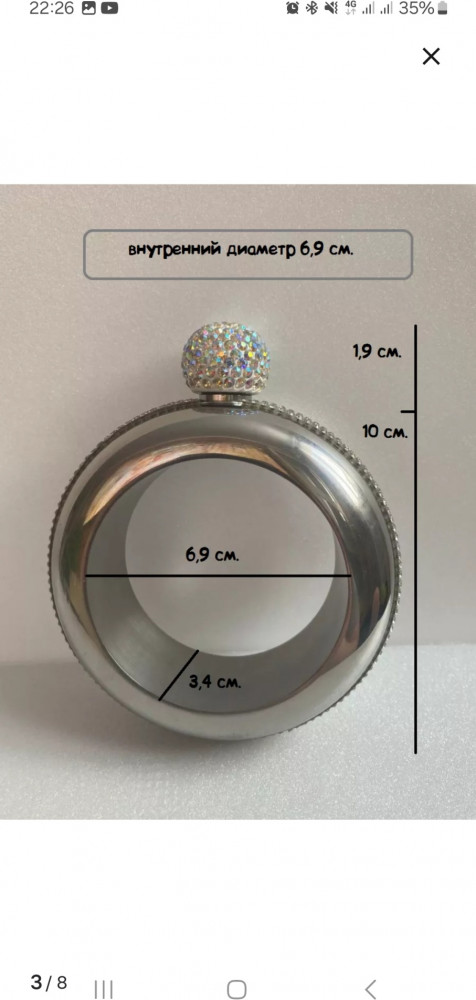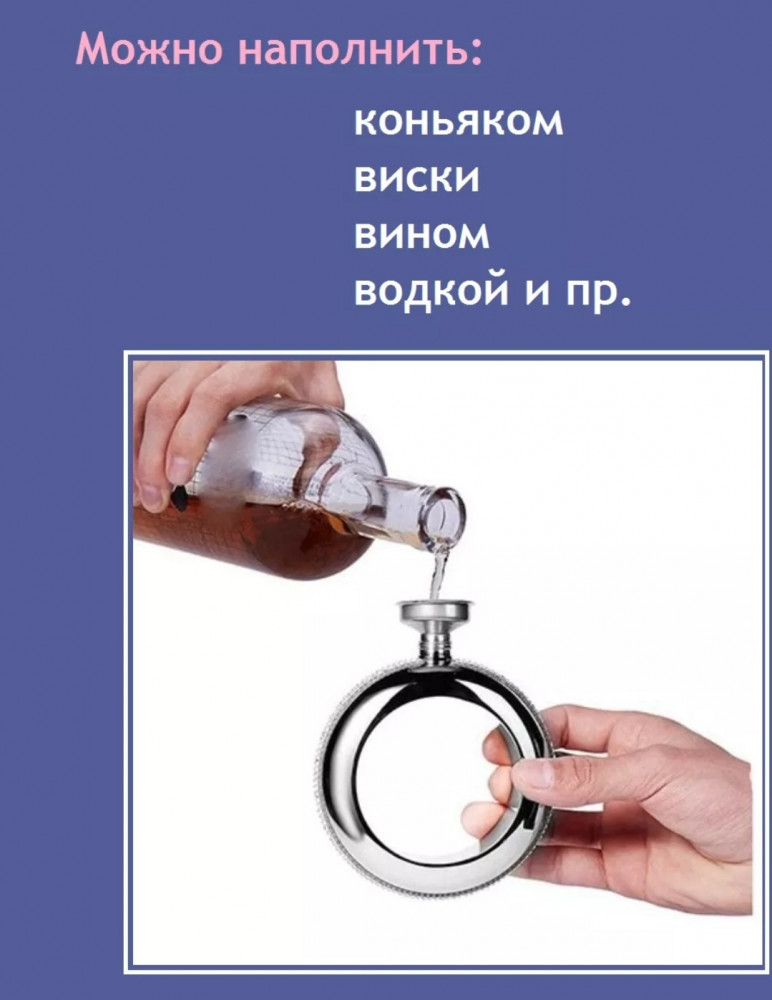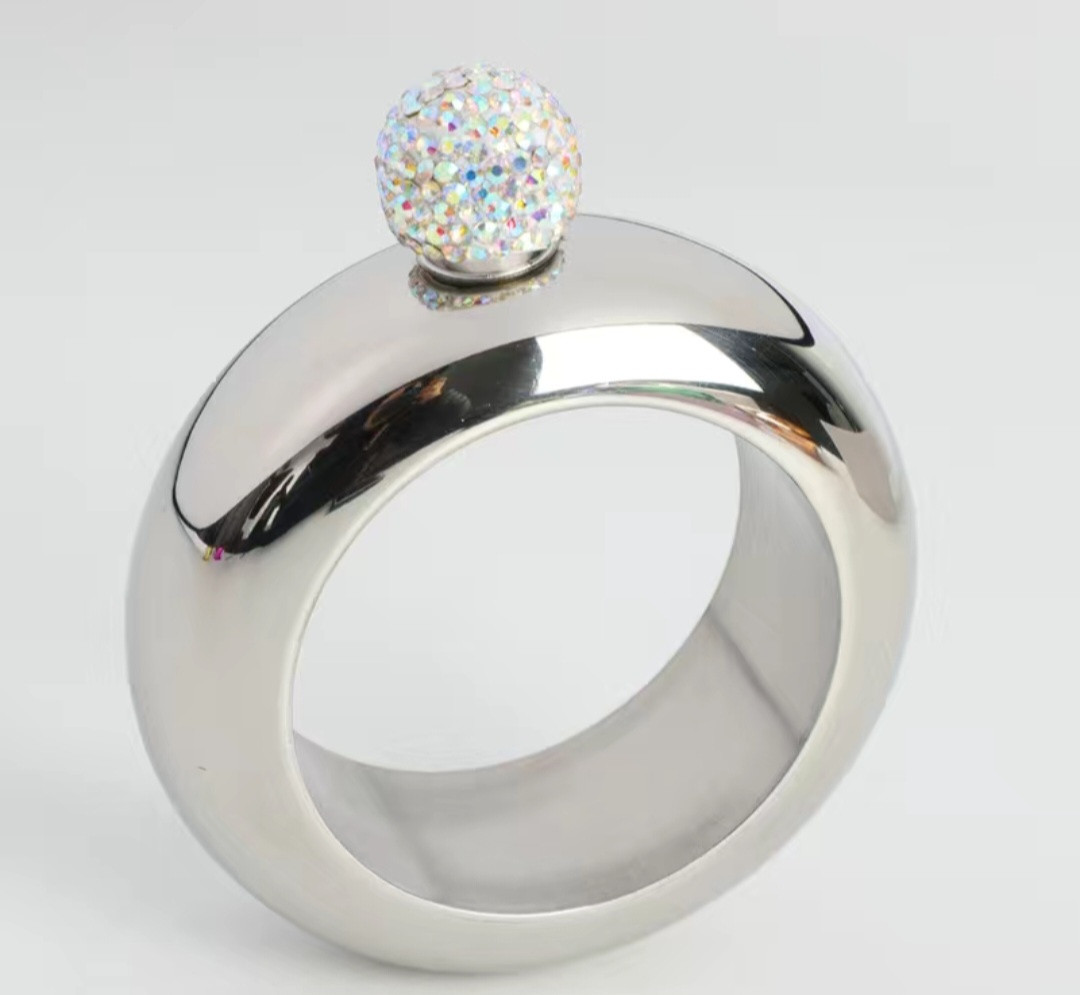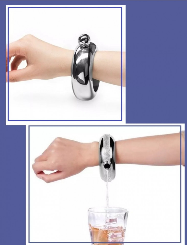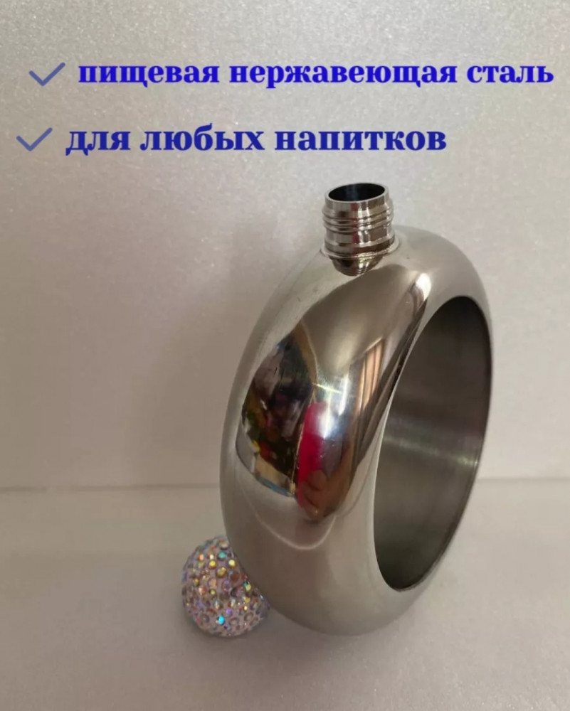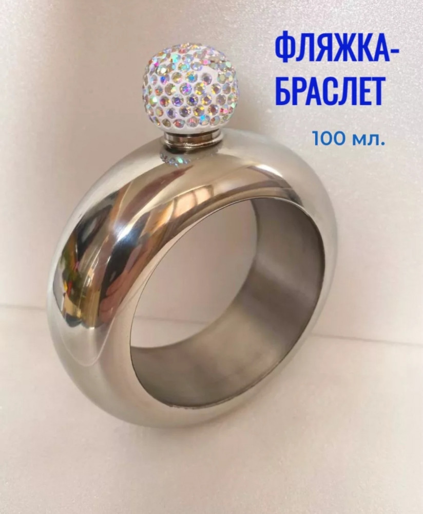 Это фляжка-браслет, объёмом 100 мл. Изделие выполнено из металла и обладает необычным дизайном: оно выглядит как массивный браслет, который можно носить на руке, а верхняя часть закрывается красивой пробкой, украшенной стразами. Такой аксессуар сочетает оригинальность с функциональностью — вы всегда сможете носить с собой небольшой запас напитка, оставаясь стильным и незамеченным. Отличный подарок для вечеринок, путешествий и просто для удивления друзей!